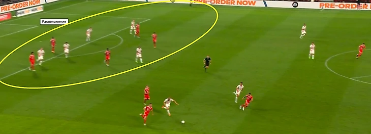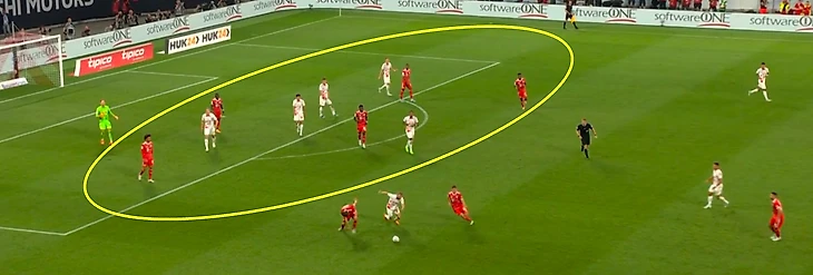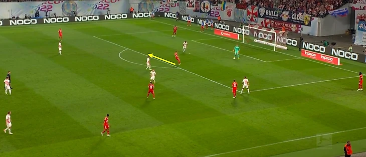 В итоге Дэвису приходилось подключаться к прессингу и оставлять Эрнандесу собственную зону. Таким образом трансформировалась схема Лейпцига при ударах от ворот, что сильно усложняло возможность отбора мяча.