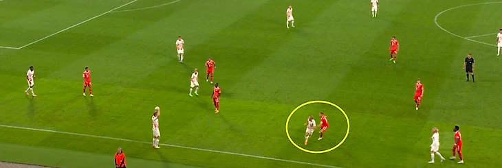 Пропущенный третий гол, который был забит на 89 минуте, также не случайный. После выхода и дебютов Мазрауи и Де Лигта Лейпциг целенаправленно начал атаковать через их зону. В первом моменте, который был создан – это ситуация, когда Забитцер, Мазрауи смотрят на мяч в момент ее выполнения, а Де Лигт остается один против троих.