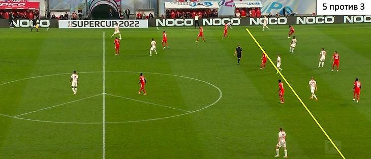 В итоге отбор Лаймера и обыгрыш Киммиха приводят Баварию не к фирменной фишке Спартака «Помогити», но Де Лигт и Мазрауи вынуждены обороняться вдвоем (по факту против четверых, потому что на правом фланге обороны остается один марокканец и 3 игрока Лейпцига.