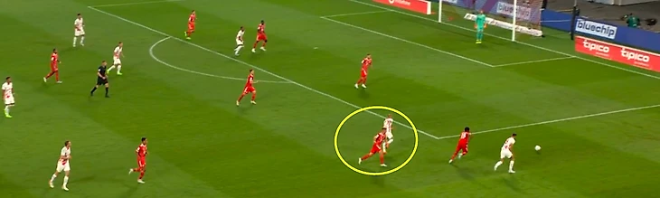 Однако на этом все не заканчивается, второй крайний защитник Лейпцига остается свободным, потому что каждый из 4 защитников уже имеет одного соперника. Сначала был свободен Клостерманн, сейчас уже Хенрикс.