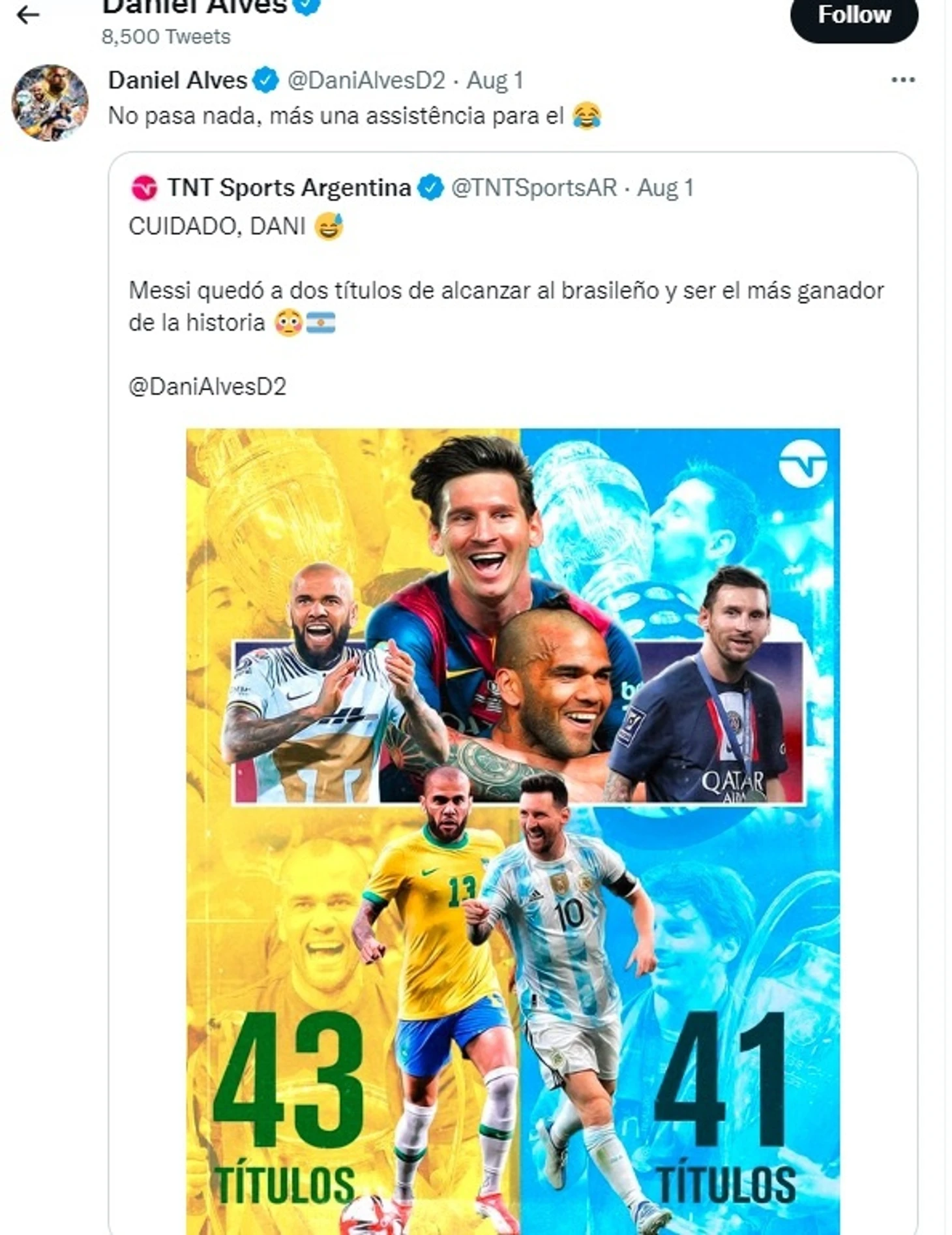 TNT Sports Argentina опубликовало фото с подсчетом наград обоих футболистов, которое прокомментировал Дани Алвес: