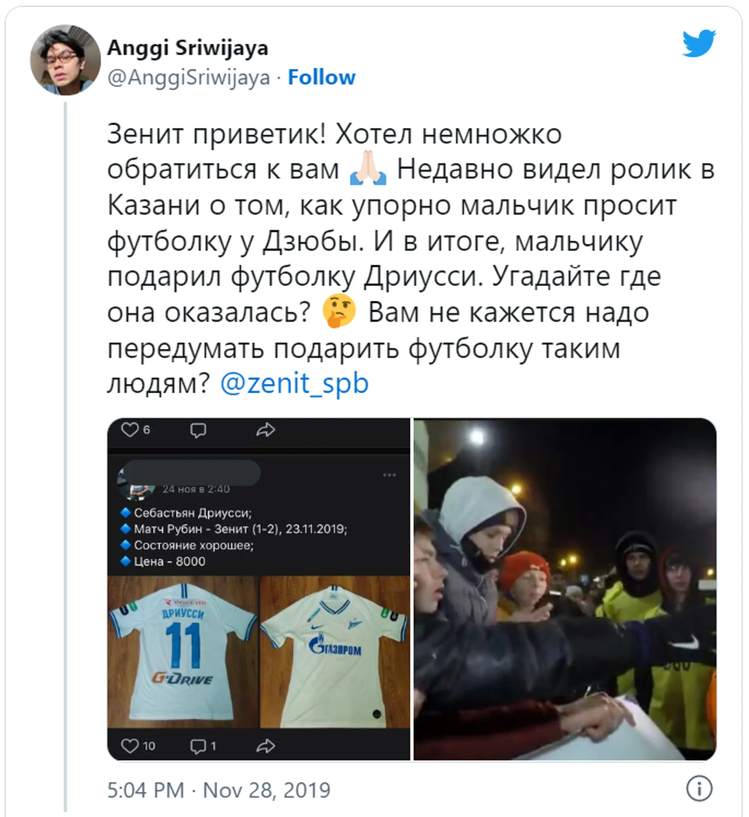 Пару лет назад прогремел скандал с перепродажей футболки бывшего футболиста «Зенита» Себастьяна Дриусси. После гостевого матча петербуржцев с «Рубином» парень получил из рук Артема Дзюбы футболку Дриусси, а потом выложил ее в соцсети с целью перепродать. Парень оценил майку в 8 тысяч рублей.