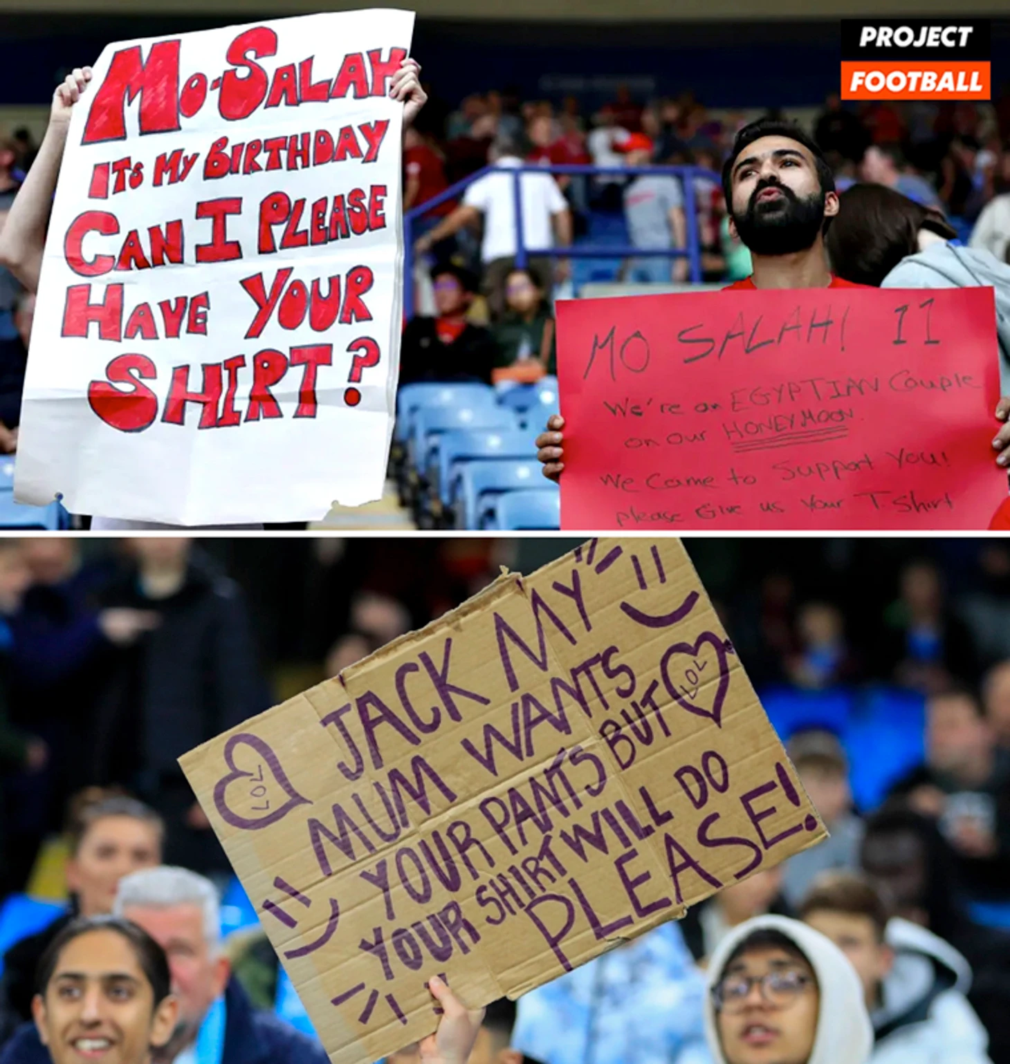 Точно неизвестно, когда плакаты с просьбами подарить футболку стали популярными. Но популярный фотохостинг Getty Images на запрос Can I Have Your Shirt sign (плакат «Можно ли мне получить твою футболку») выдает фото персональной болельщицы Икера Касильяса с ЧМ-2014.
