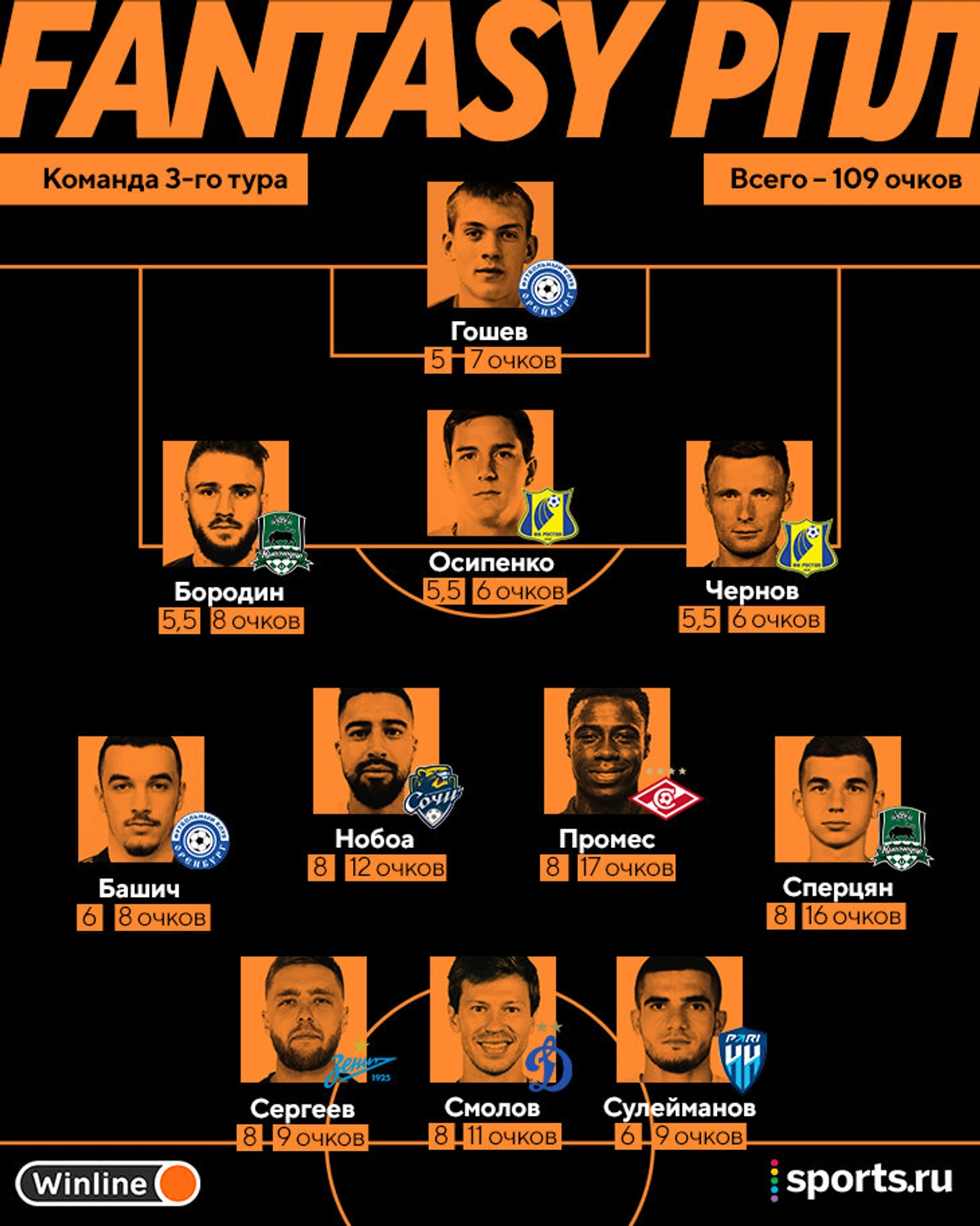 🤩 Лучший состав в 3-м туре Fantasy РПЛ: герой Промес, вспышка Нобоа, гений стандартов Сперцян и – внезапно – вратарь Гошев