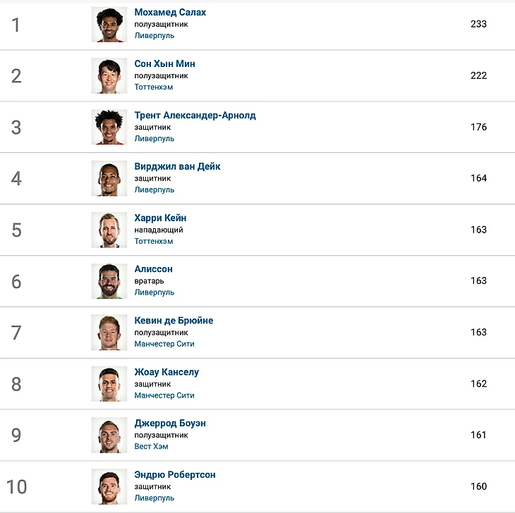 Главные герои те же: в топ-100 по очкам за прошлый сезон нет футболистов, уехавших из Англии. Десятка лучших была такой: