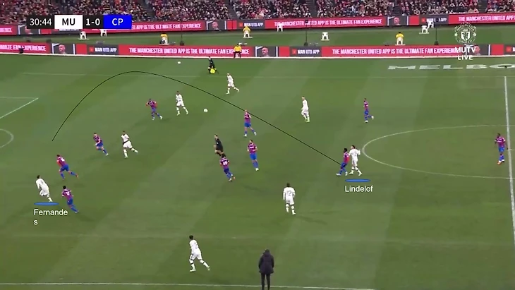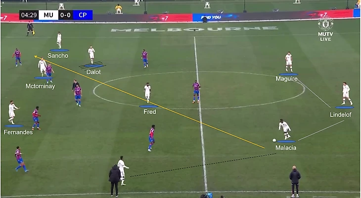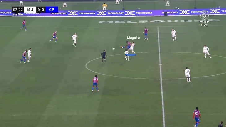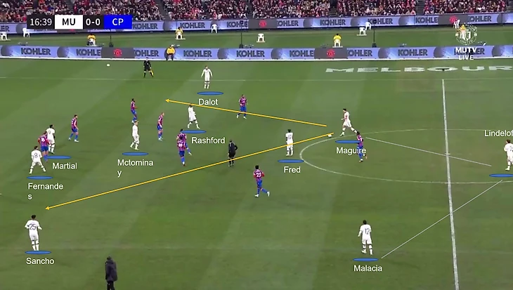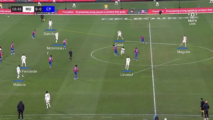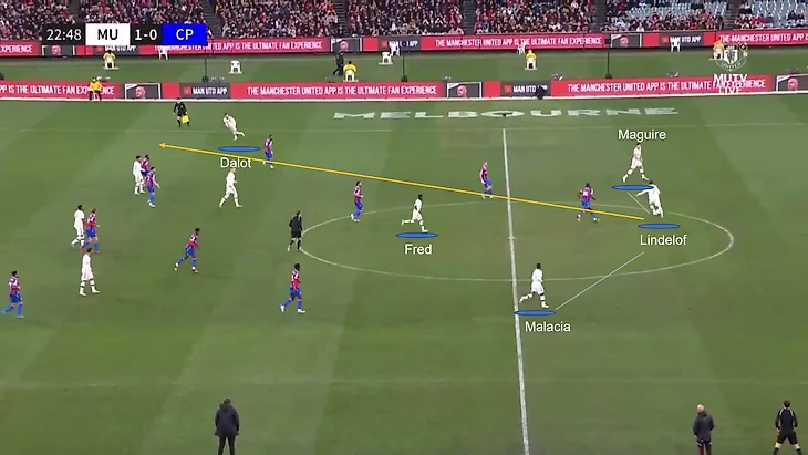 Это создает варианты как слева, так и справа для Магуайра, поскольку «Юнайтед» стремится растянуть «Пэлас». Это также причина, по которой тен Хаг так сильно хотел Мартинеса, поскольку центральные защитники должны иметь возможность создавать моменты из глубины и направлять мяч по обеим сторонам.
