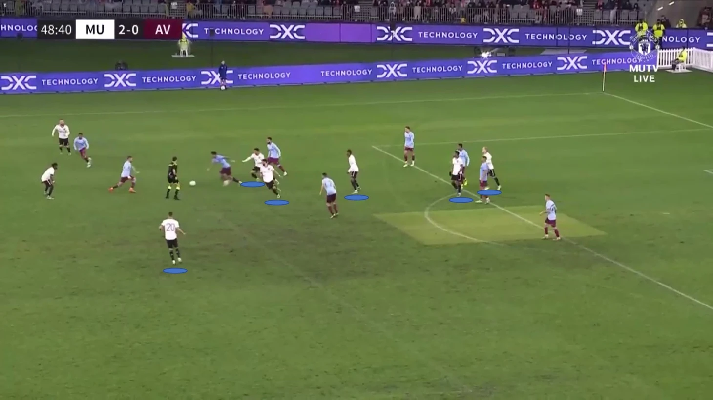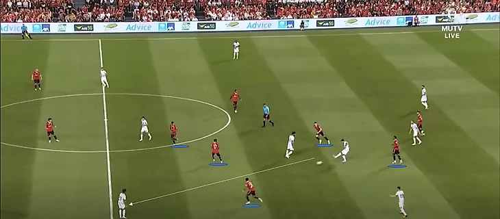Маласия создает пространство для Рашфорда, а Мактоминей является выдвинутым вперёд полузащитником, вся оборона КП занята игроками, некоторые из которых не являются нападающими, что также открывает зону для Санчо. Наглядно продемонстрировано манипулирование пространством с помощью выдвинутого полузащитника и инвертированного защитника.