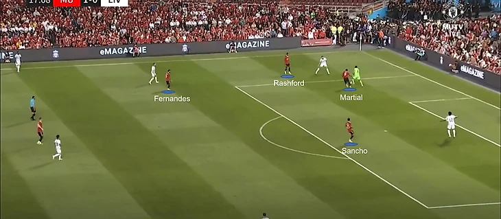 Мне очень понравилось наблюдать за расстановкой «Юнайтед» в форме 3-1, когда два центральных защитника, крайний защитник и Фред выходят на прием от защиты, а другой крайний защитник инвертируется, чтобы быть вариантом в полузащите, открывая в данном случае пространство для Санчо.