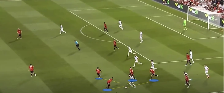 После того, как под руководством Рангника не было никакой реальной атакующей структуры, Тен Хаг снова заставил забегать нападающих «Юнайтед». Я упомянул, что ЦЗ имеют решающее значение для создания из глубины, потому что тогда они могут напрямую смотреть на забегающих игроков атаки.