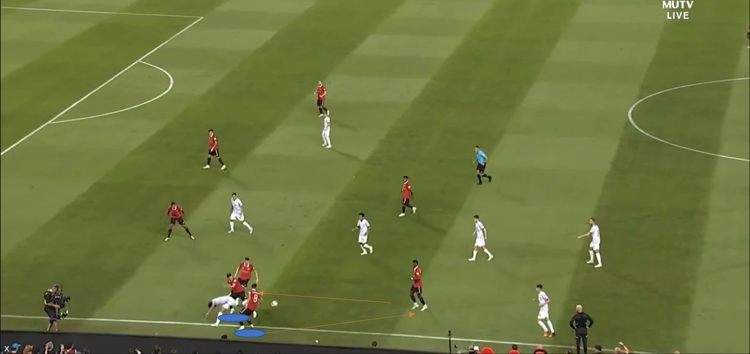 На какой бы стороне ни находился мяч, игрок близок к тому, чтобы стать вариантом передачи для трех игроков. Это означает, что они могут либо стянуть игроков, либо стать запасным вариантом для передачи, если Фред находится под прицелом, поэтому «Юнайтед» может либо выйти из защиты в атаку широко или по центру через бразильца.
