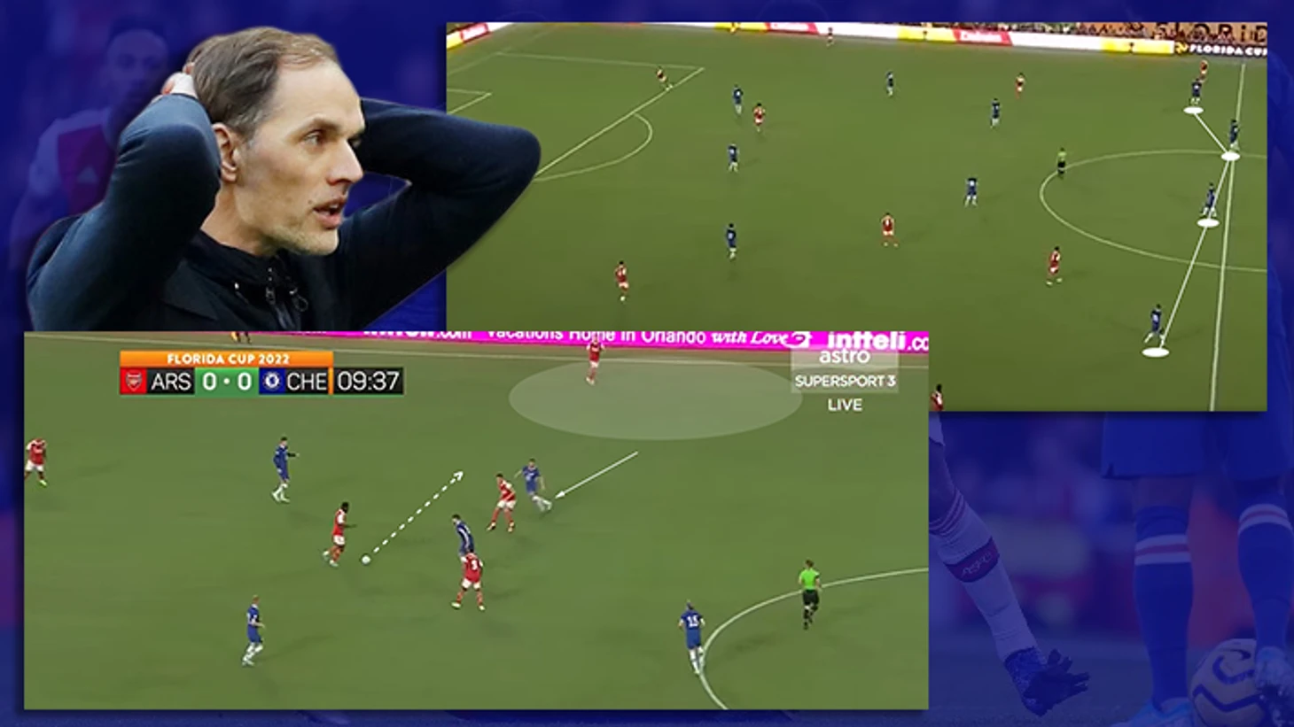 Уже в первом тайме были видны проблемы с понимаем того, кто, кого и когда должен прессинговать или сопровождать. Да, явные трудности возникали именно без мяча. На первом скриншоте видно, что крайний нападающий без задней мысли сместился в центр, дабы оказать давление на полузащитника. В расстановке, где латераль выжигает всю бровку, данное действие было бы вполне приемлемым, и игрок на фланге тоже бы оказался под давлением. Но здесь Рис Джеймс не может так рисковать, т.к. надёжнее сохранить численное превосходство в задней линии, ведь сейчас там всего лишь два центральных защитника. В итоге Арсенал легко разрушили прессинг соперника.