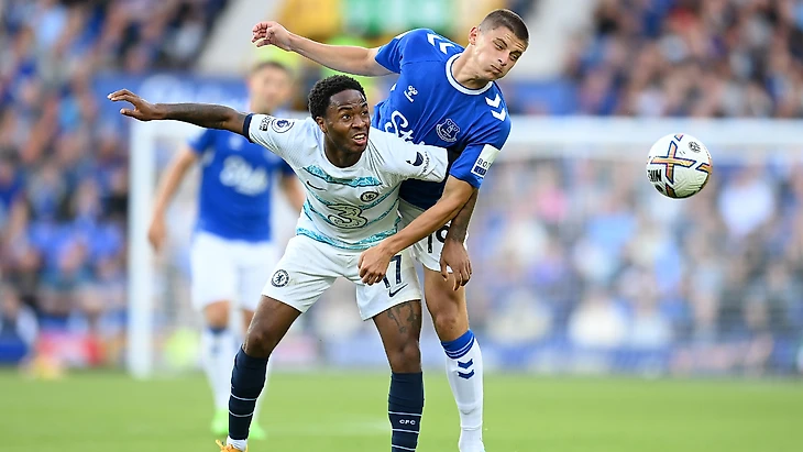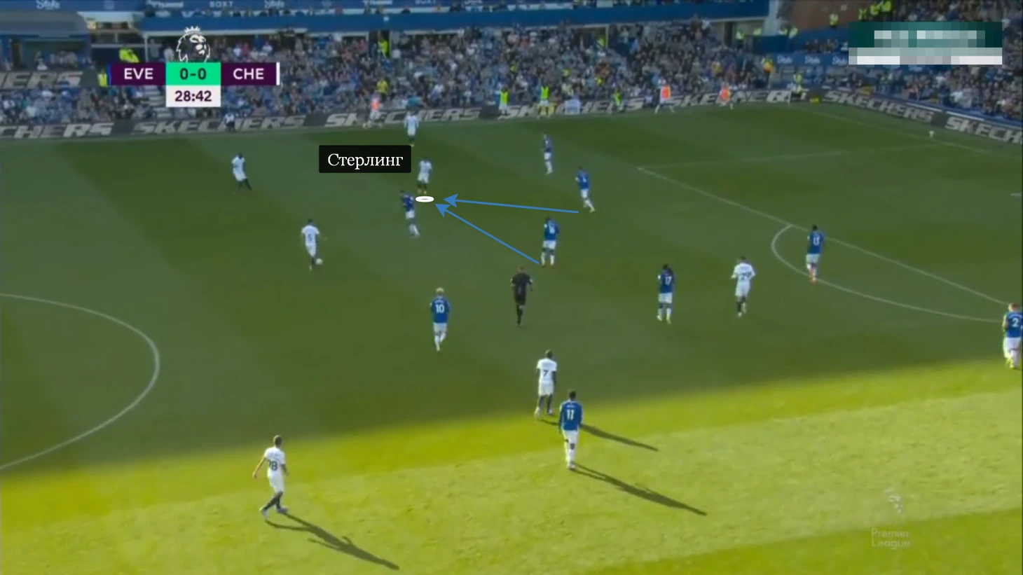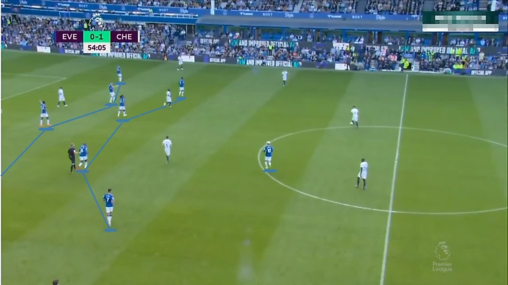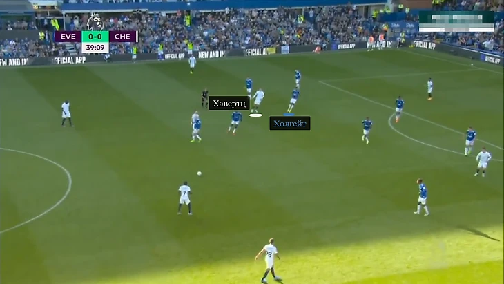 «Челси» пытался растащить «Эвертон» за счет десяток. Главным героем в тактике Тухеля оказался Рахим Стерлинг. Новичок открывался чуть вглубь, под 45 градусов к опорной зоне, чтобы вытянуть соперника, принять пас и либо продвинуть мяч на дриблинге, либо передать игроку под рывок.