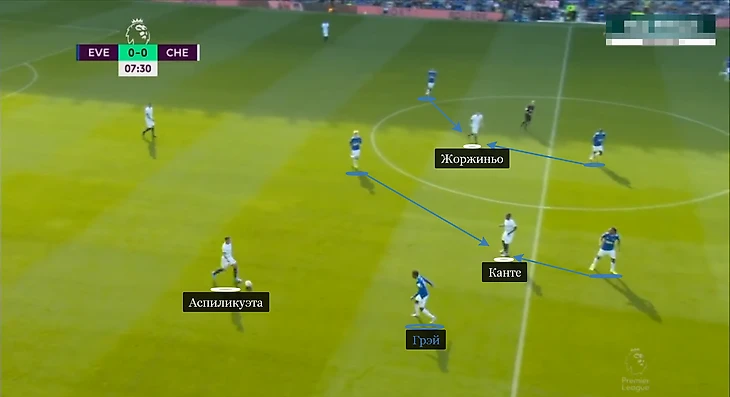 Ниже – иллюстрация. Грэю необязательно стоять в опорной зоне: Н’Голо Канте и Жоржиньо прикрыты партнерами. Демерэй мог броситься на Сесара Аспиликуэту, но отбежал, чтобы прикрыть пас в среднюю треть.