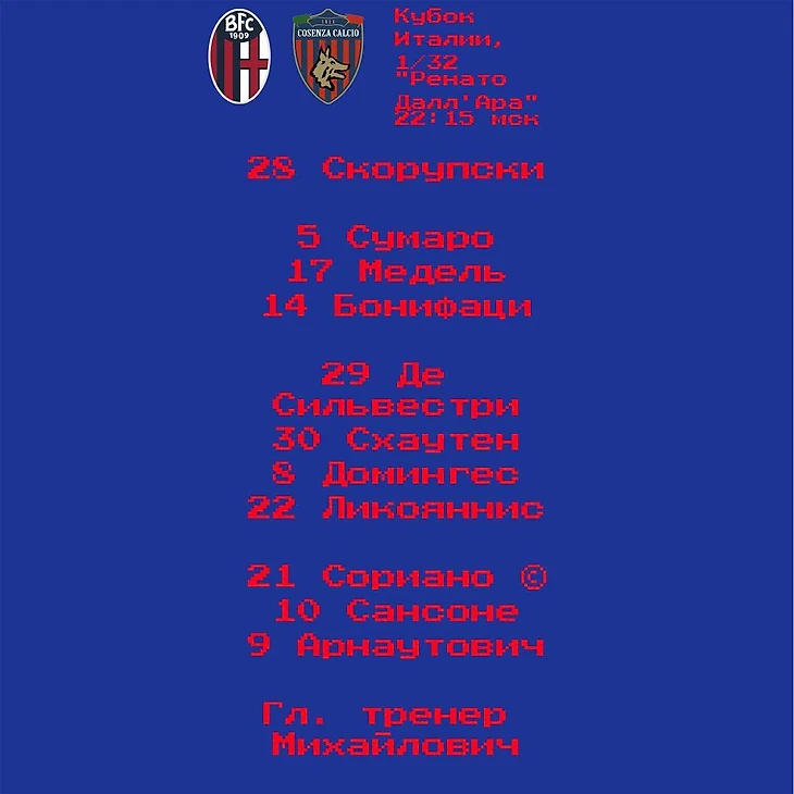 Что удивило с положительной стороны, так это нацеленность латералей красно-синих на навесы и прострелы в штрафную. Особенно хорош был в этом новичок Ликояннис: не всегда точно, но было понятно, кому он хочет сделать передачу. Во 2Т "Болонья" продолжила обхаживать штрафную гостей и начала потихоньку заводиться, ведь пробить поймавшего кураж Матушевича никак не удавалось. Самый реальный шанс был у Де Сильвестри, на этот раз прицельно пробившего головой, но вновь на высоте был вратарь "Козенцы".