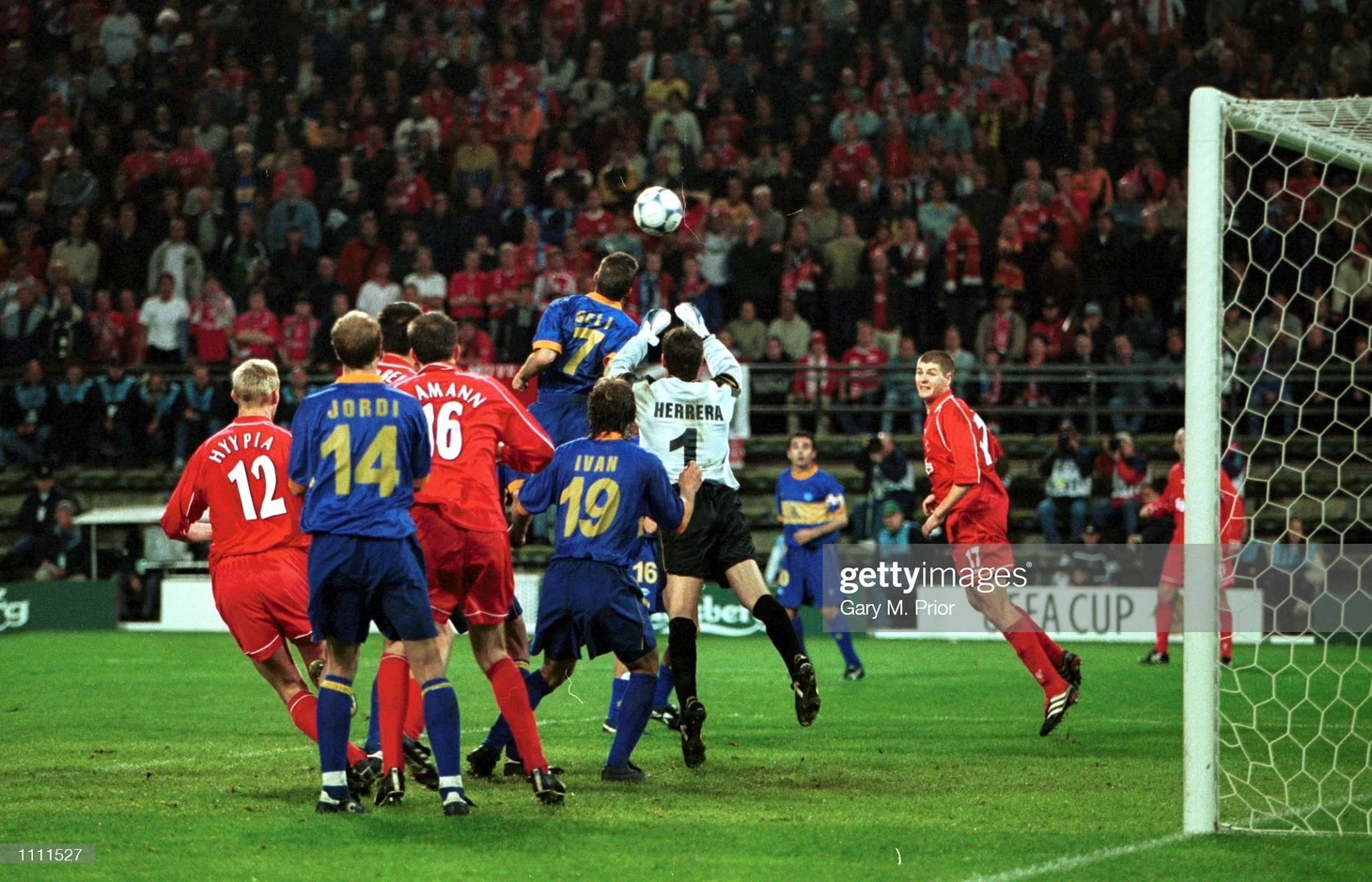 Финал Кубка УЕФА 2001 года получился полной противоположность своему "предшественнику". Если в 2000 году "Галатасарай" и "Арсенал" ни разу не сумели поразить ворота друг друга за 120 минут, то год спустя за такое же время было забито целых девять мячей! Если в выходе в решающий матч турнира "Ливерпуля" нет ничего удивительного, то его соперник добился невероятного успеха. Дело в том, что "Депортиво Алавес" дошел до финала Кубка УЕФА в своем дебютном еврокубковом сезоне! "Ливерпуль" был фаворитом матча, но противостояние получилось крайне упорным. Уже к 16-ой минуте подопечные Жерара Улье благодаря голам Маркуса Баббеля и Стивена Джеррарда вели 2-0, но на 27-ой минуте Иван Алонсо сократил разницу в счете и вернул свою команду в игру. На 41-ой минуте Гарри Маккалистер ударом с пенальти восстанавливает разницу в два мяча и при счете 3-1 команды уходят на перерыв. Но к 51-ой минуте счет был равным! Дубль Хавьера Морено возвращает интригу в матч.