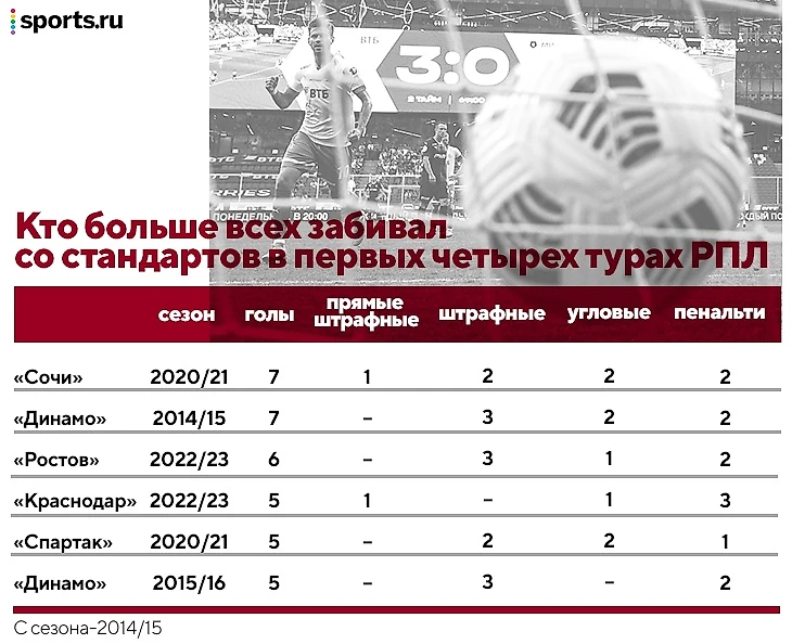 С сезона-2014/15 рекорд по голам со стандартов за чемпионат – у «Зенита» и «Спартака». В сезоне-2015/16 петербуржцы забили 22 таких гола (13 + 9 с пенальти), в сезоне-2020/21 москвичи полностью повторили этот результат.