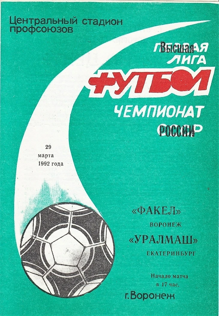 Наспех выведенные чёрной краской поверх белых букв слова "ВЫСШАЯ" и "РОССИИ" на программках, 9000 болельщиков на трибунах, ещё несколько месяцев назад не чаявших увидеть родную команду в классе сильнейших, гости из города, ещё несколько месяцев назад называвшегося совсем по-другому… Так 29 марта 1992 года воронежский Факел впервые стартовал в высшей лиге нового чемпионата — чемпионата России.