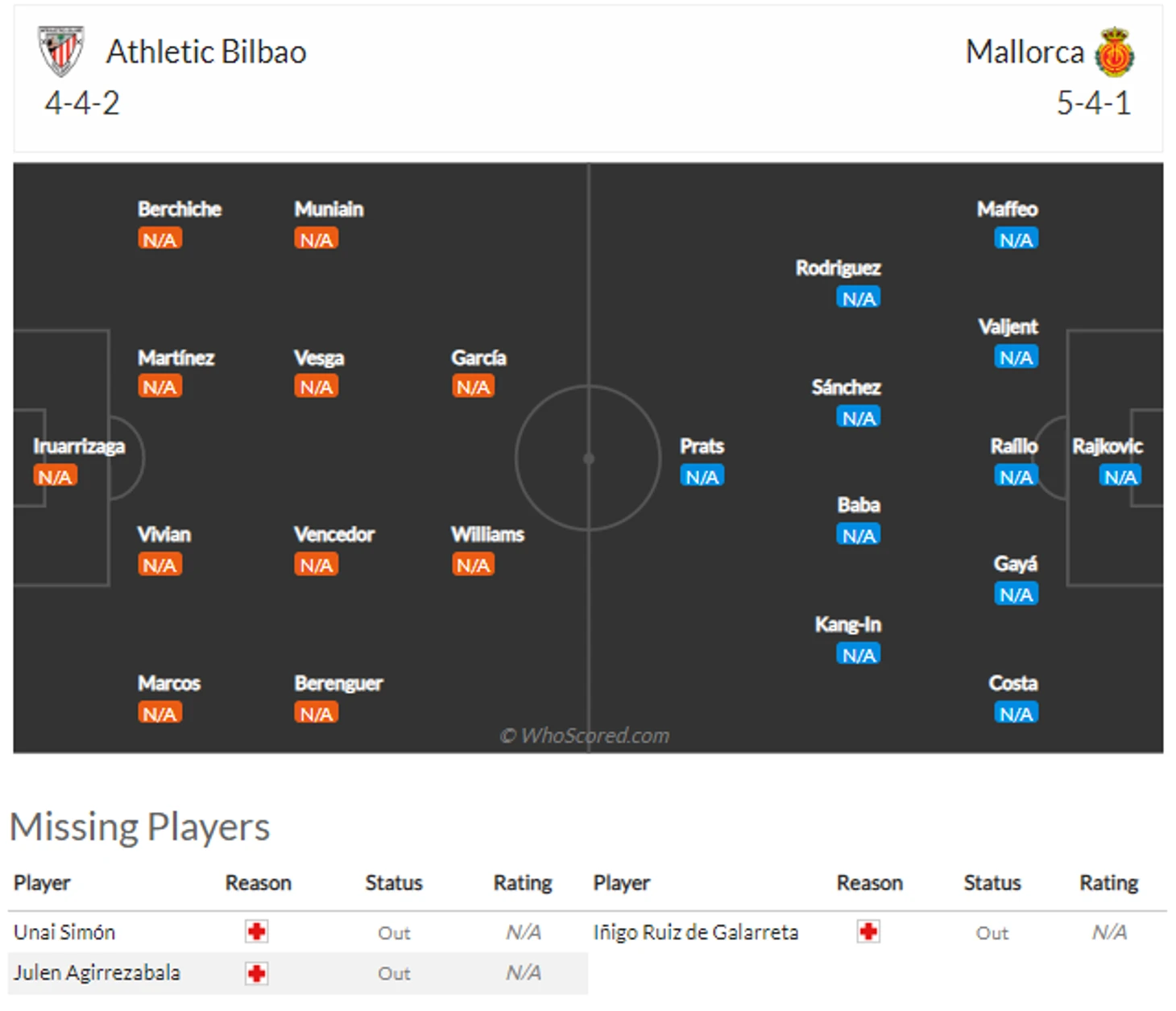 Но это все про светлое будущее, а в суровом настоящем у хозяев - сразу две проблемы в обороне: во-первых не совсем здоров Иньиго Мартинес(6), а во-вторых под вопросом выход в старте Унаи Симона(6). Киперу было бы полезно подлечить свою спину ещё пару недель, но его бэкап Хулен Агирресабала(5) сломал запястье и пропустит около месяца. Поэтому у Вальверде шикарный выбор - либо форсировать возвращение Унаи Симона, либо начинать сезон с совсем неопытным Ирруарисагой(?) в рамке.
