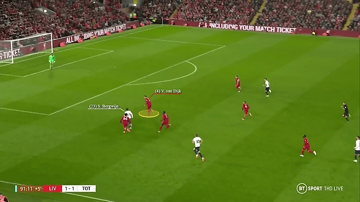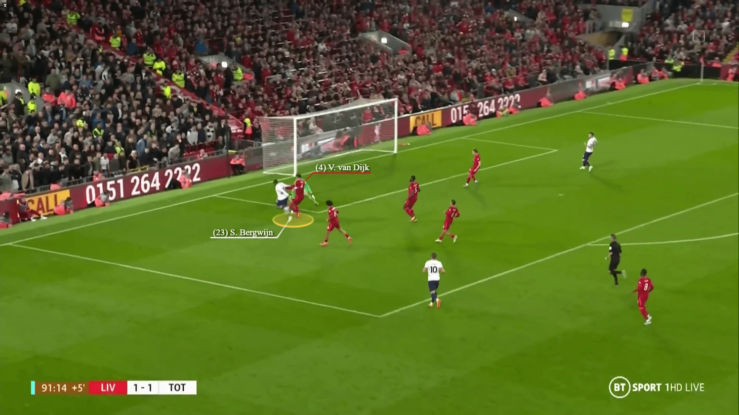 В первом примере, из домашней майской игры против «Тоттенхэма», Ван Дейк оказывается один на один со Стевеном Бергвейном, который, похоже, контролирует ситуацию, продвигаясь к штрафной.