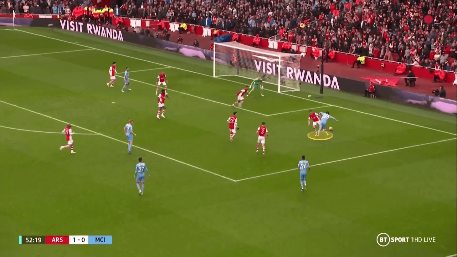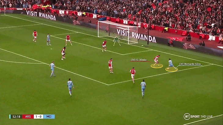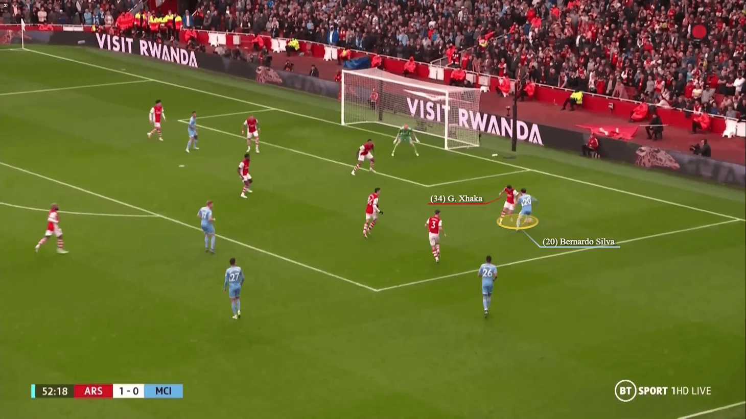 Гранит Джака из «Арсенала» оказался в аналогичной ситуации в матче против «Манчестер Сити» в прошлом сезоне. Защищаясь, он остается один на один с Бернарду Силвой, который врывается в штрафную.