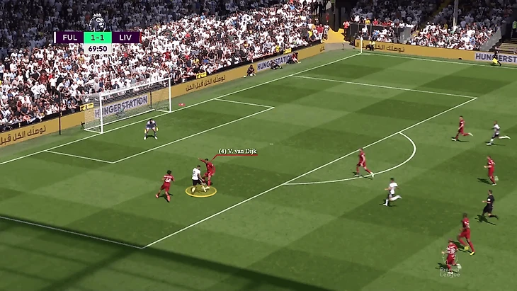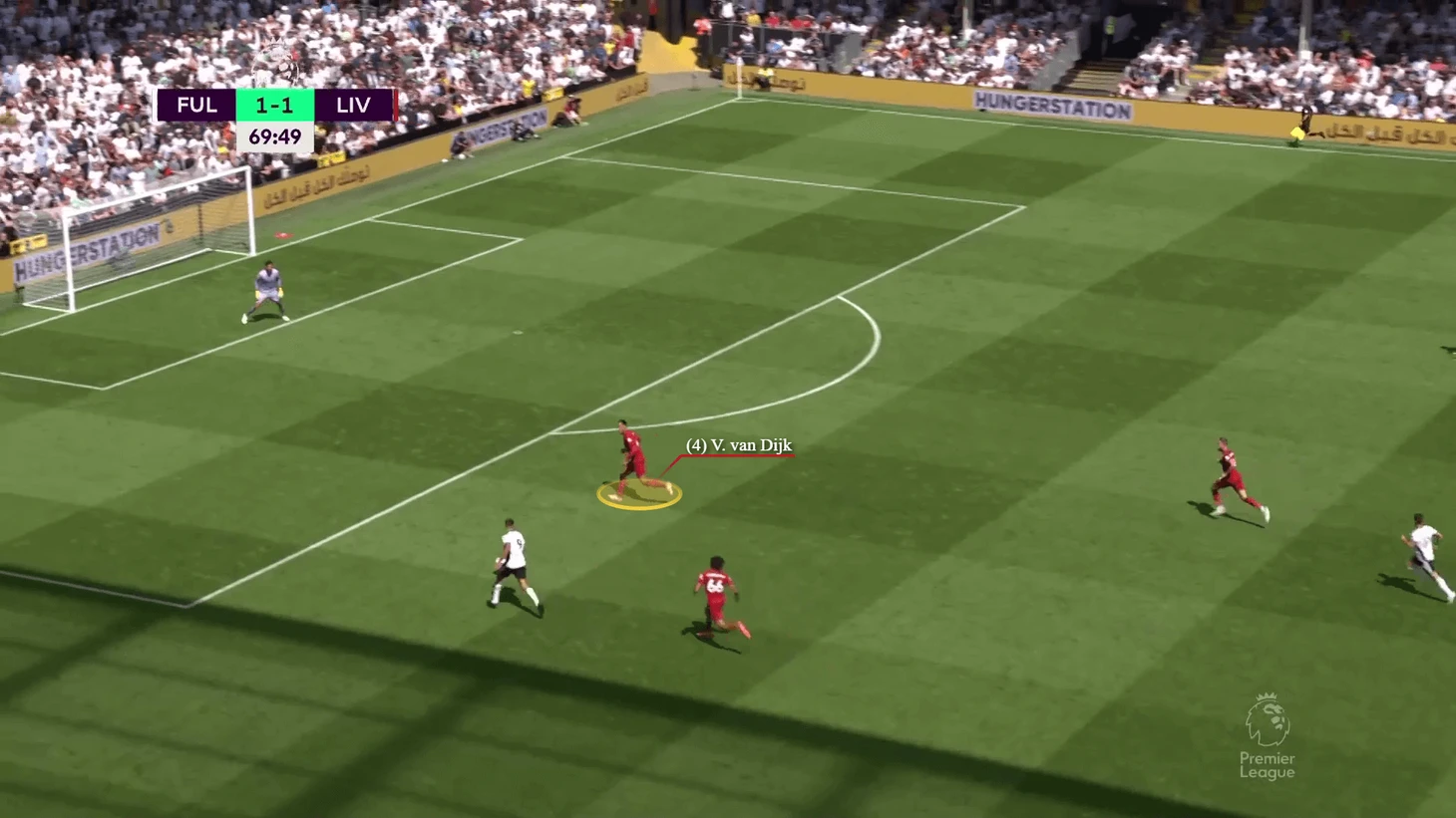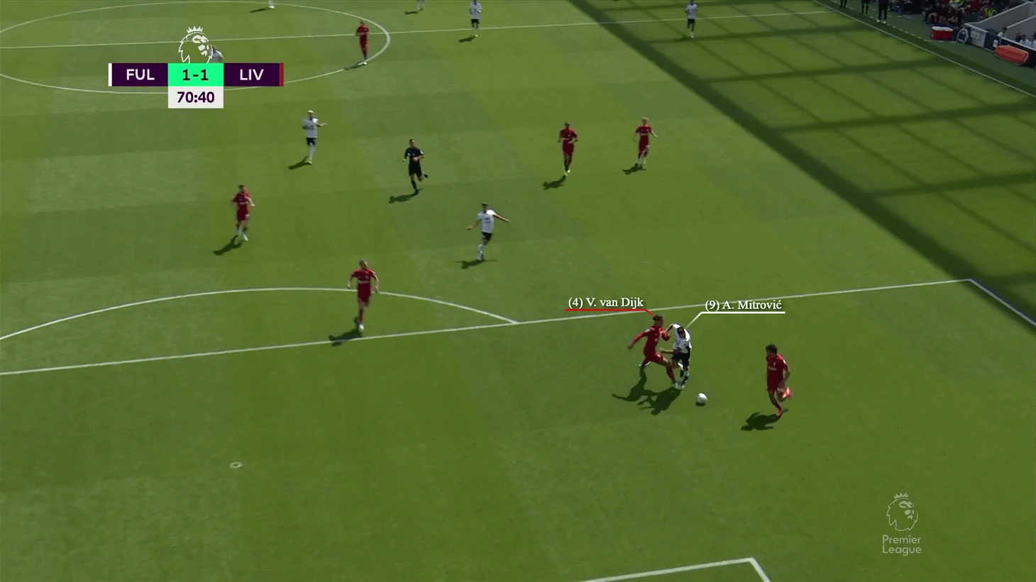 В таких ситуациях Ван Дейк стремится сдержать игрока соперника, позволяя своим товарищам по команде восстановить позицию и предложить поддержку. В данном случае Трент Александер-Арнолд обеспечивает это прикрытие и, вполне возможно, был в лучшем положении, чтобы отобрать мяч у Митровича, если бы тот прокинул бы мяч мимо голландца.