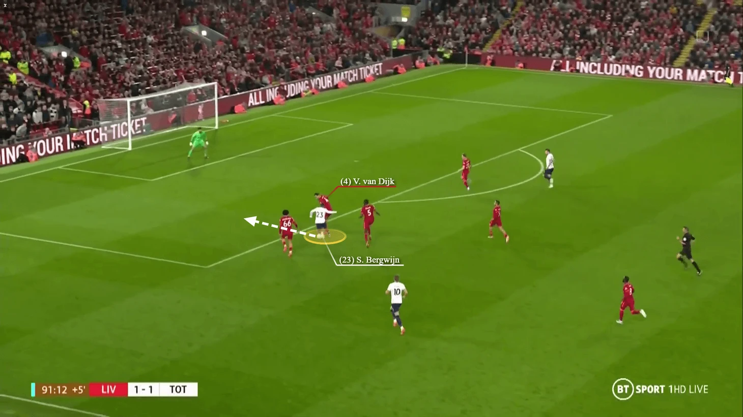 Поддержка Ибраима Конате затрудняет проход в центр, но защитник поощряет Бергвейна пойти влево. Он не пытается вступить в единоборство, вместо этого ожидая движения; Ван Дейк держит баланс, так что он также может ускориться с Бергвейном и использовать свою силу, чтобы освободить его от мяча.