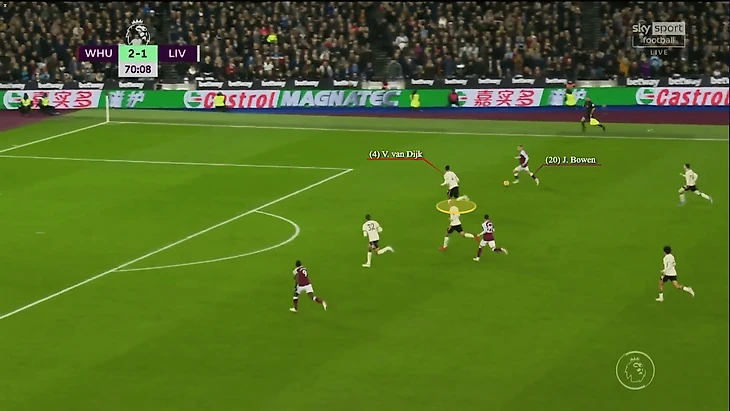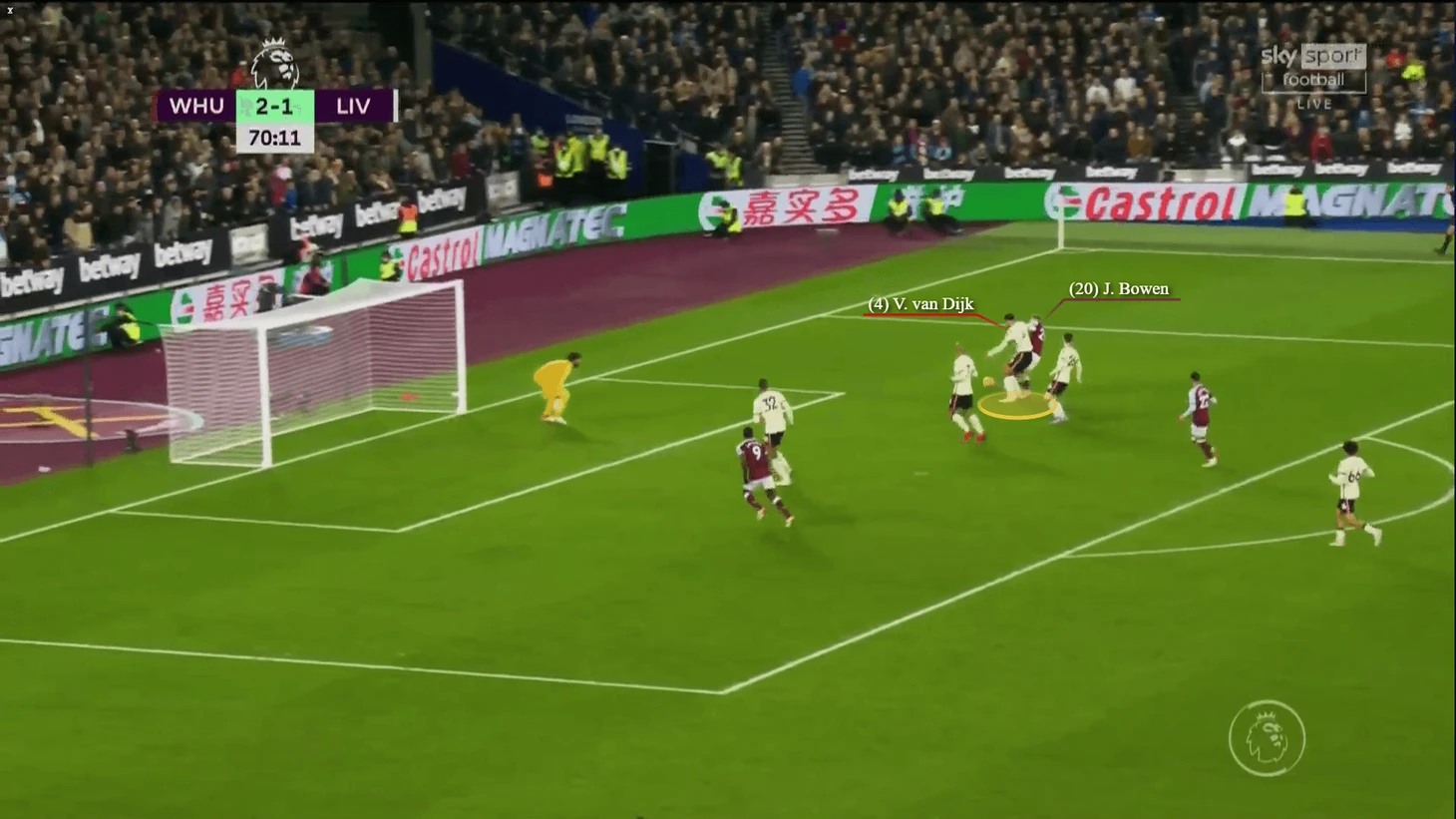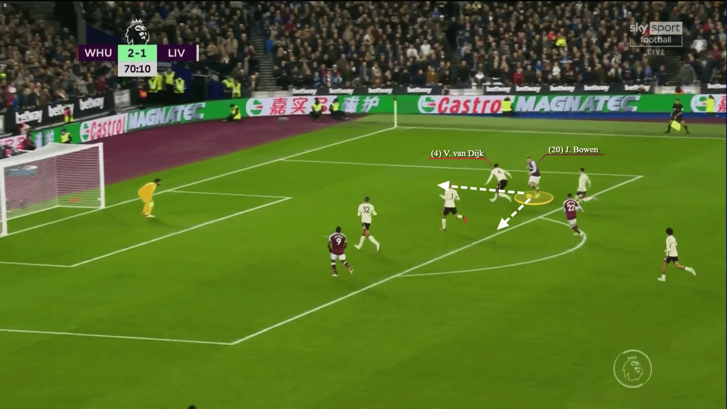 Точно так же на противоположном фланге против Джеррода Боуэна (во время визита «Ливерпуля» в гости к «Вест Хэму») он проявляет терпение, позиционируя себя так, чтобы вингеру было трудно сместиться в центр.