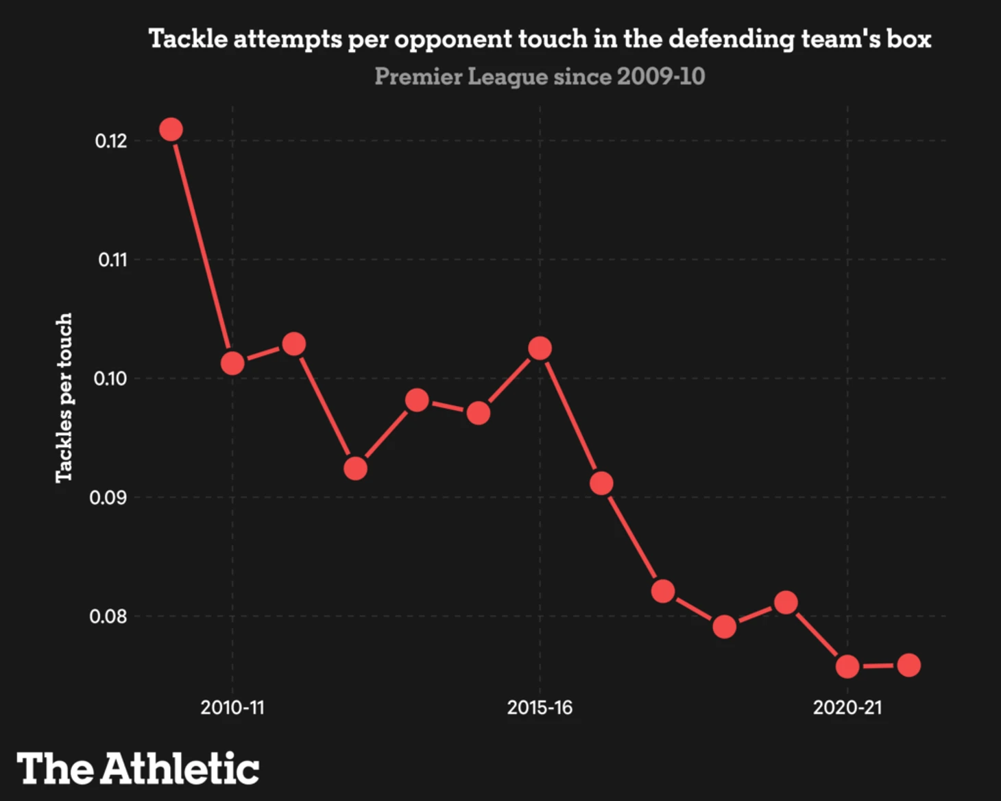 Подкаты — это риск, который начинают осознавать защитники Премьер-лиги, о чем свидетельствует количество подкатов, предпринимаемых в защитной трети команды. В конце сезона 2009/10 этот показатель составлял 2,42 за игру. К концу кампании 2021/22 годов он снизился до менее чем 2,05.