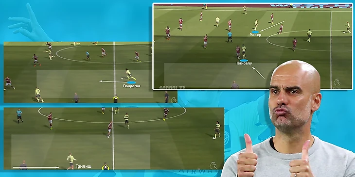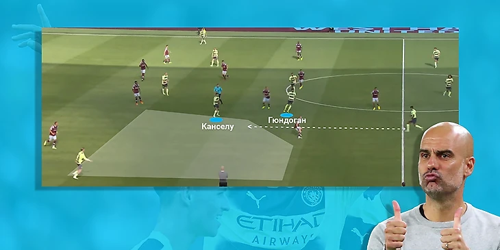 Понравилось, как Манчестер Сити манипулировал атакующей группой игроков Вест Хэма. Канселу и Уокер играли роль ложных фулбеков, хотя обычно Кайл формирует тройку в первой стадии, а Жоао смещается в центр. Из-за данных манипуляций оборонительная структура молотобойцев становилась узкой, появлялось свободное пространство на фланге. Джек Грилиш и Илкай Гюндоган заполняли эти освободившиеся зоны, а немец вообще иногда менялся ролью с Канселу, что ещё сильнее расшатывало оборону соперника.