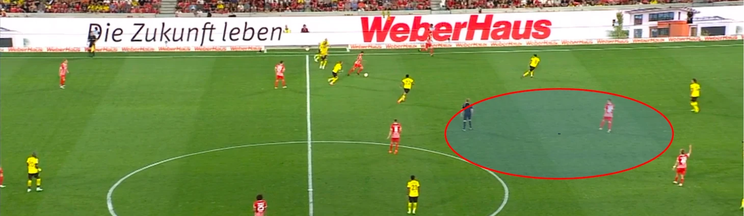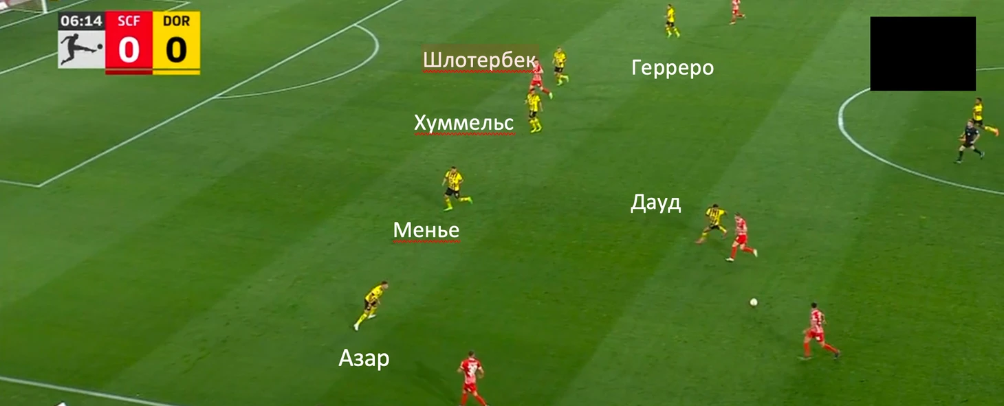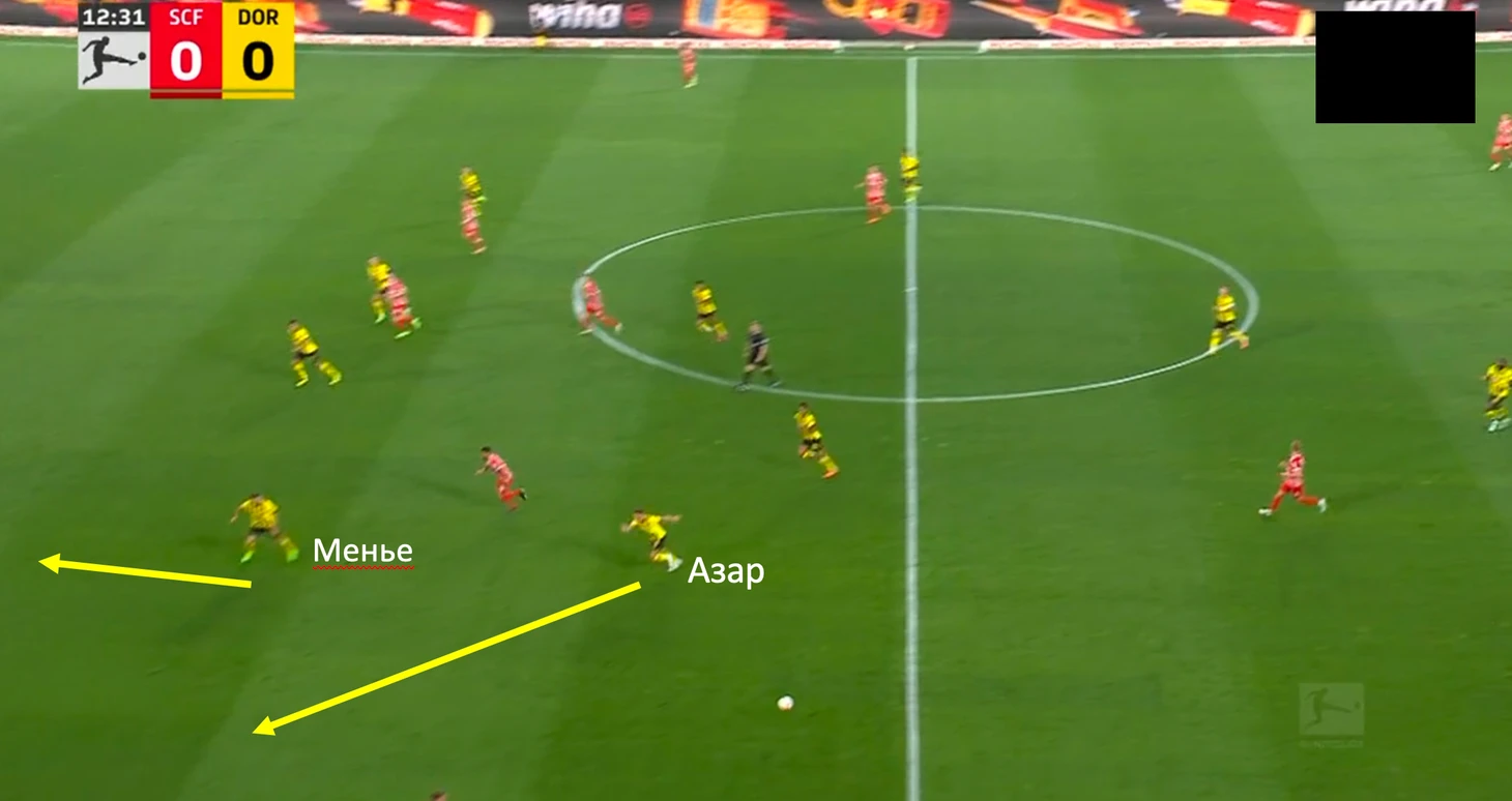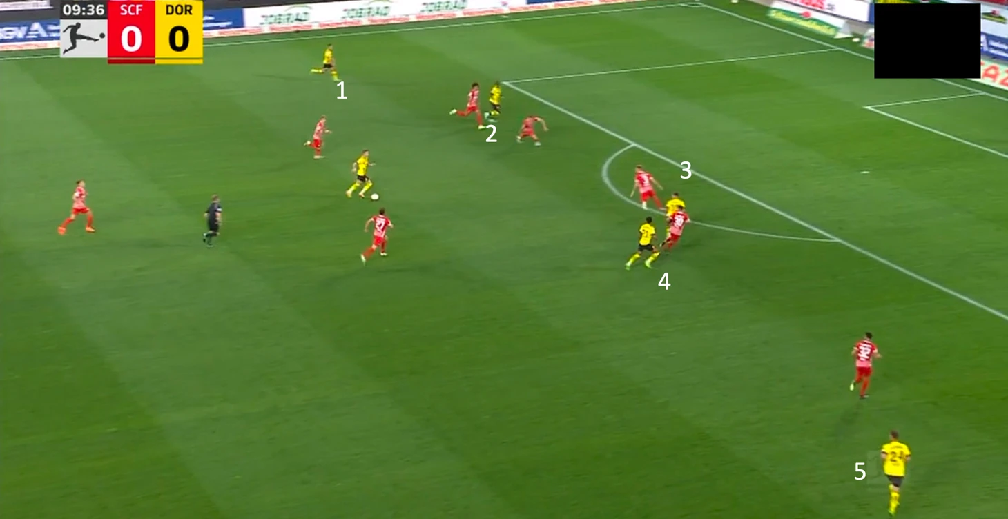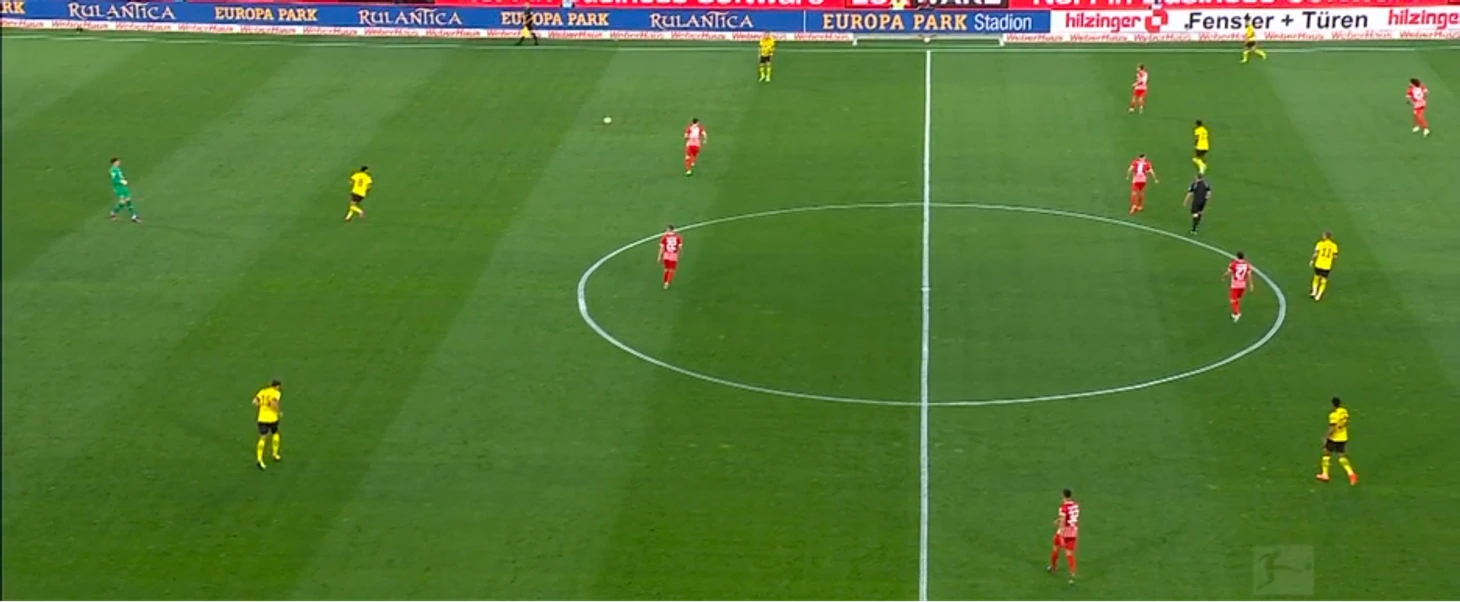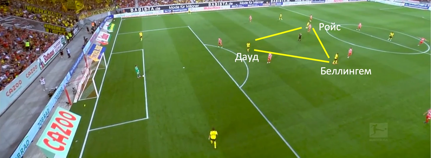 Создавая билд-ап из 3 игроков против 2 игроков Фрайбурга или 4 против 3 игроков Байера, а также фланговых защитников Боруссии на краях полузащиты, приводит к 5 атакующим игрокам в последней трети поля и быстрому преодолению центра поля Фрайбурга или треугольнику на краю штрафной соперника. Треугольник из двух игроков фланга и Ройса/Белингема.
