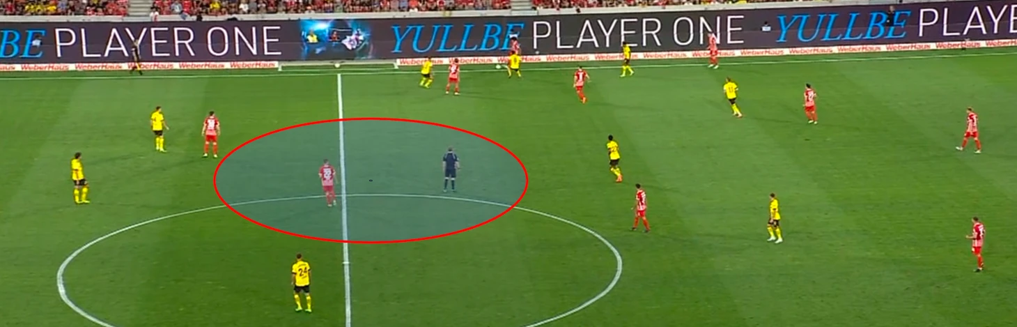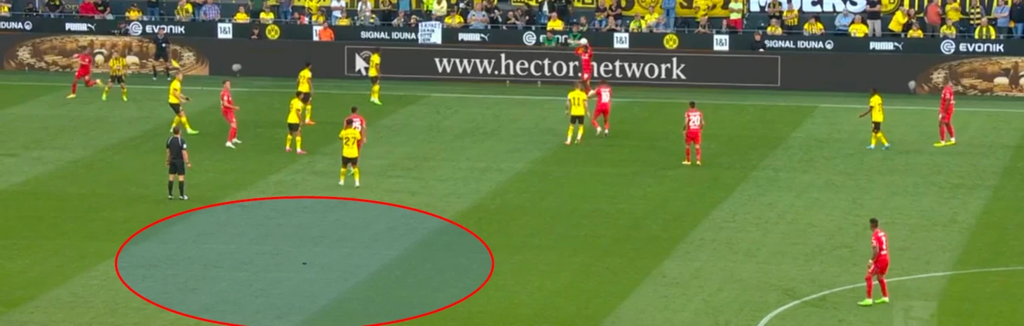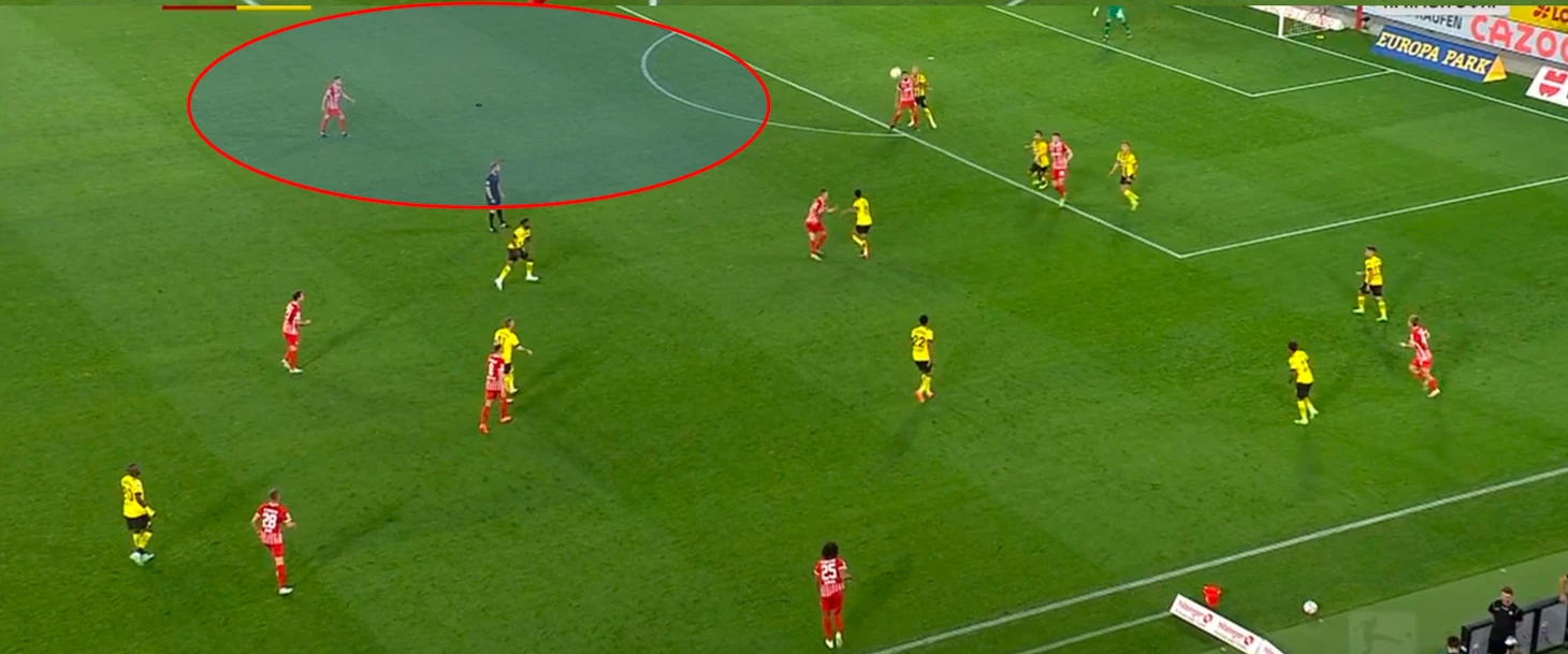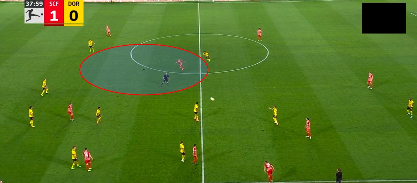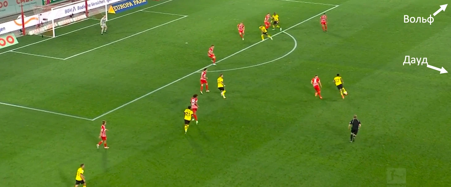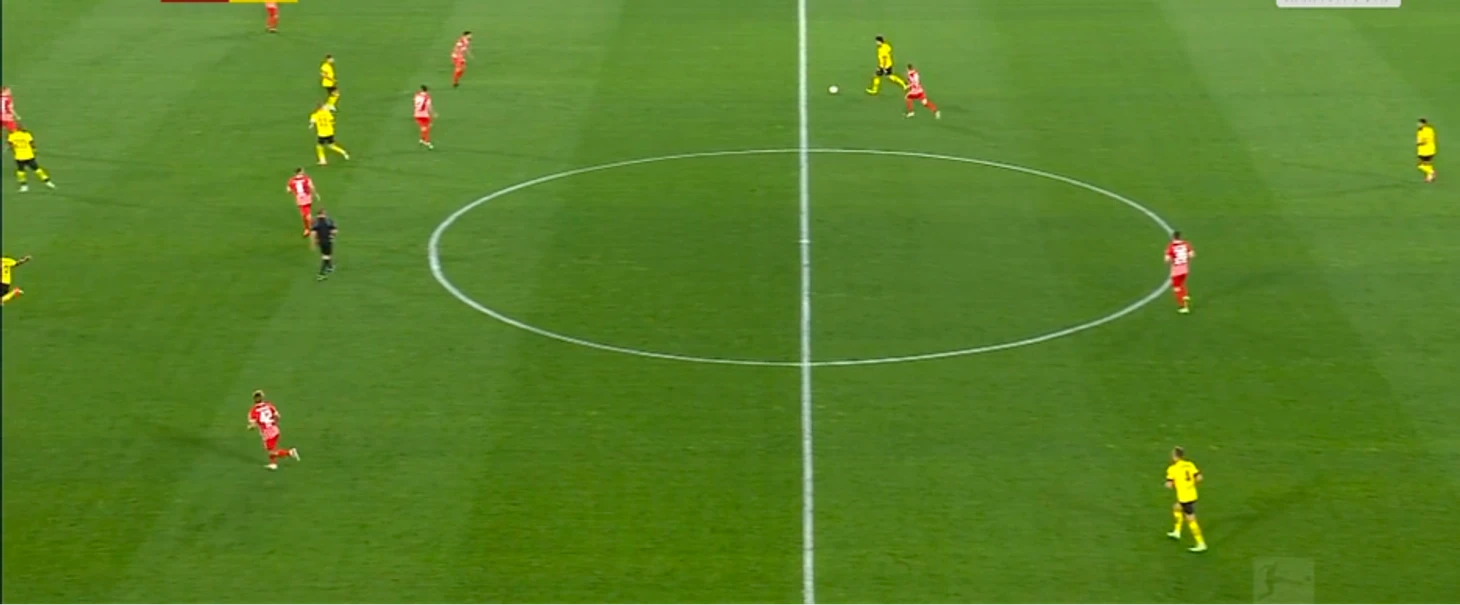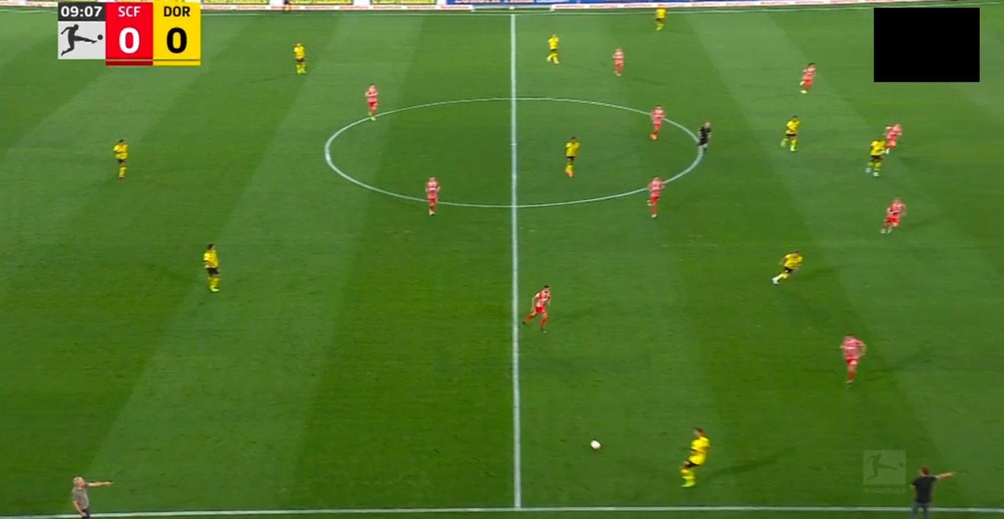 Создавая билд-ап из 3 игроков против 2 игроков Фрайбурга или 4 против 3 игроков Байера, а также фланговых защитников Боруссии на краях полузащиты, приводит к 5 атакующим игрокам в последней трети поля и быстрому преодолению центра поля Фрайбурга или треугольнику на краю штрафной соперника. Треугольник из двух игроков фланга и Ройса/Белингема.