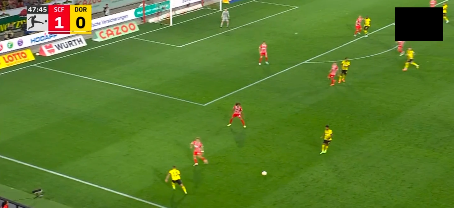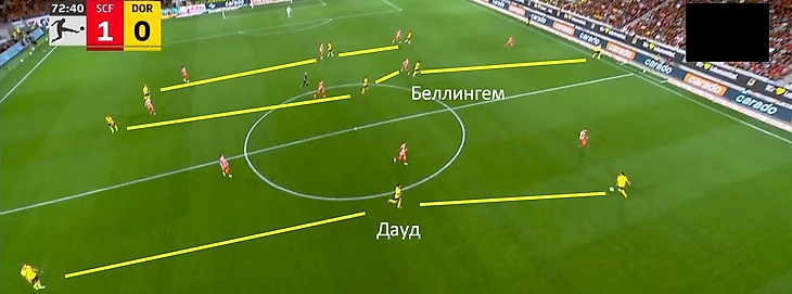 Белингем получает мяч, на него выдвигается Эггестайн, но Ройс, используя свободное пространство позади игрока Фрайбурга, получает мяч.