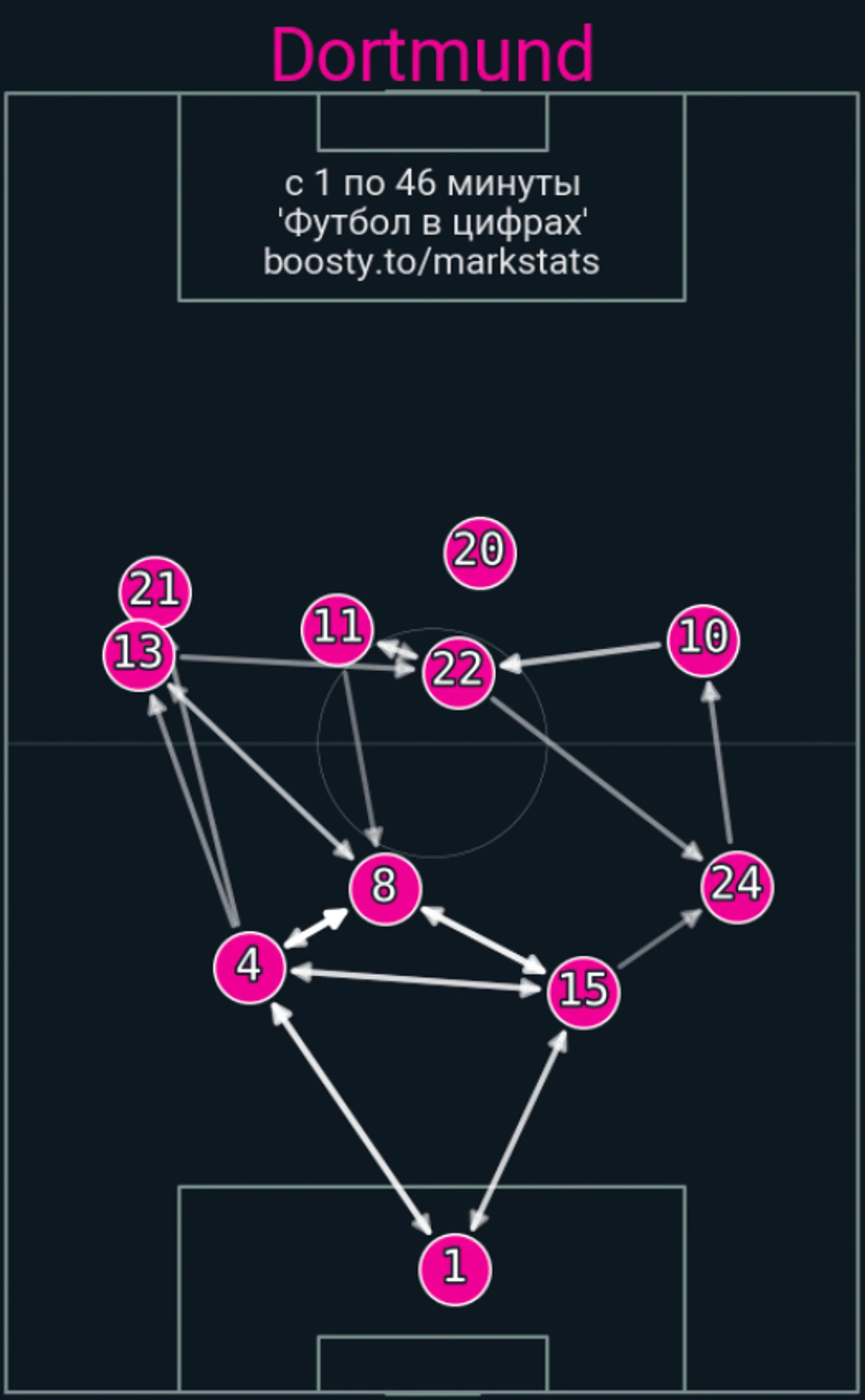 В итоге Боруссия выбегает в атаку, где атаку Ройса поддерживают сразу 5 игроков на флангах, полуфлангах и в центре.