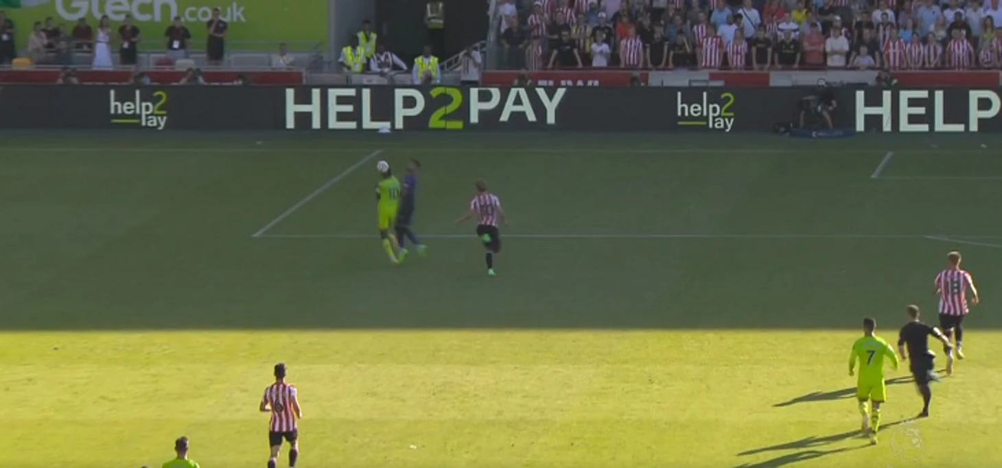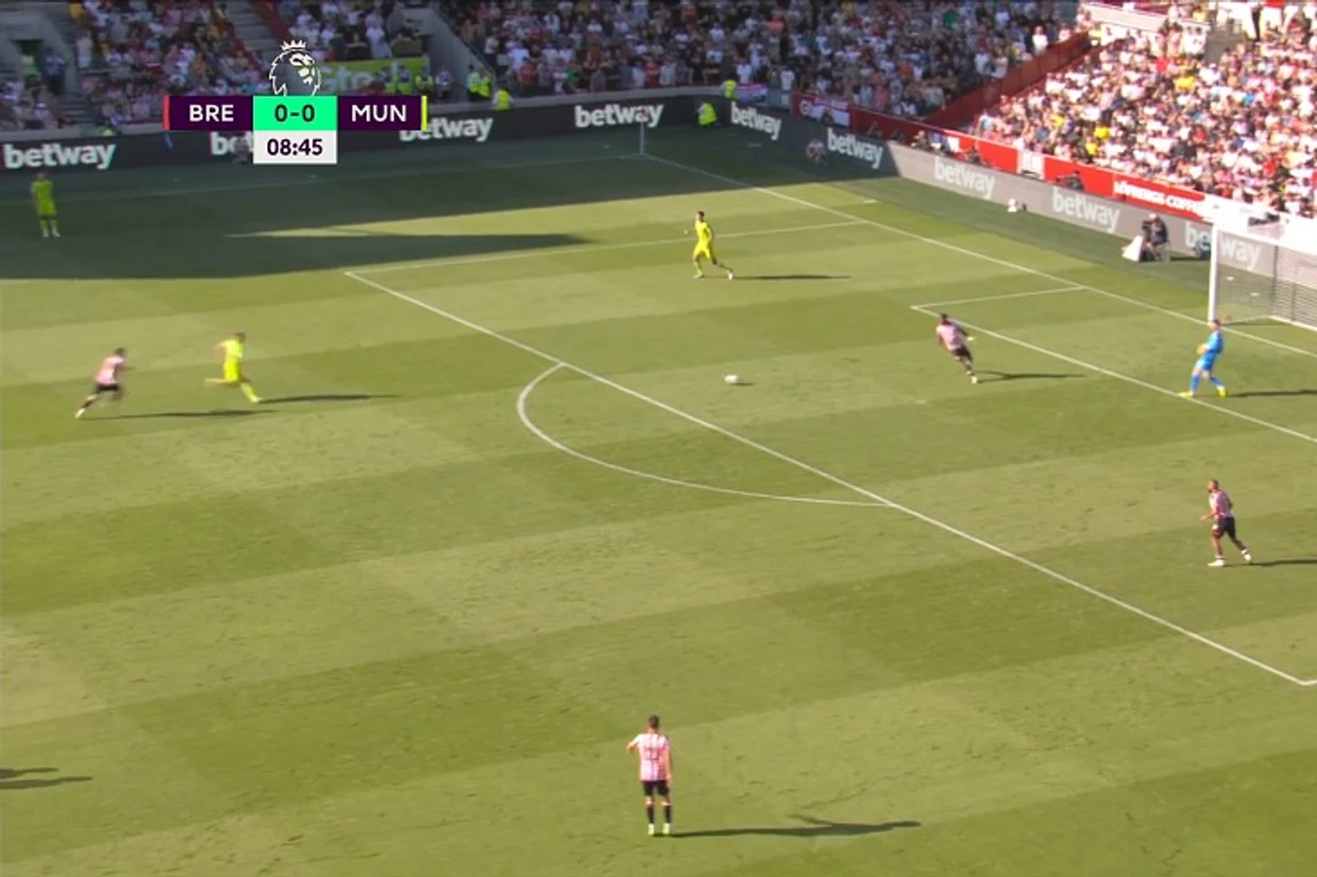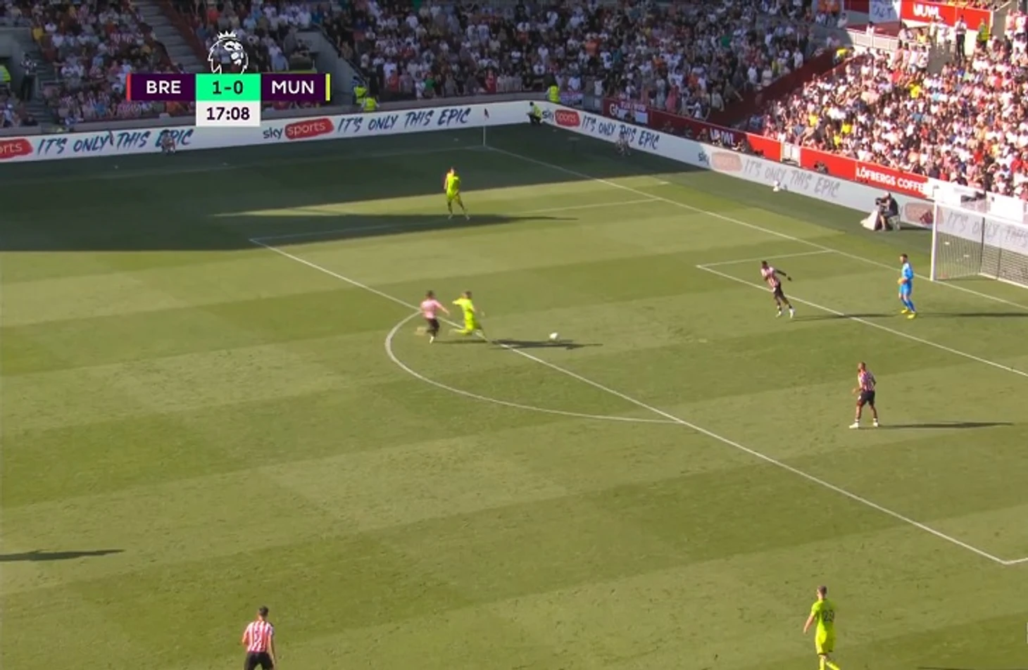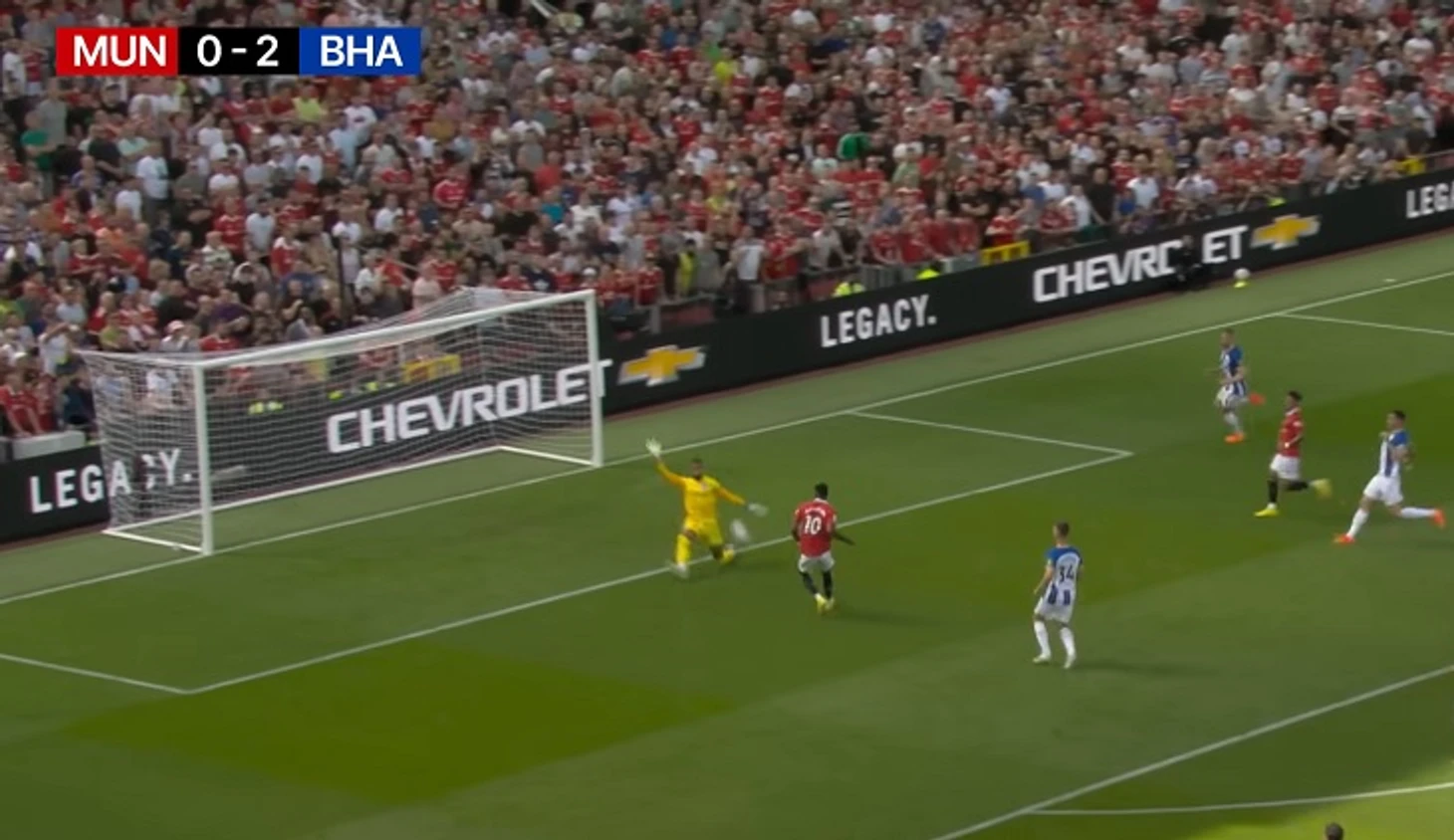 Вратарь в эти моменты выглядел как робот, который не имеет права отклониться от алгоритма: принять от Мартинеса – отдать на Эриксена – повторить. На обоих скринах выше одиноко стоит Магуайр.