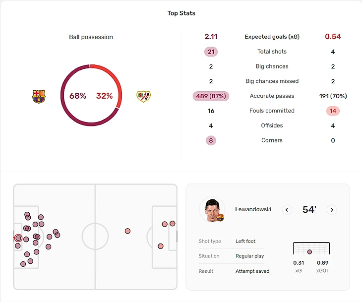 В концовке Барса плотно прижала Райо, который плотно вбился в штрафную всей командой (схема представляла собой что-то вроде 7-0-3), и явно наиграла как минимум на гол (1,47 xG согласно infogol), нанеся 21 удар (6 в створ) и сохраняя владение под 70%. Однако, из-за глупого и ненужного фола Бускетс схлопотал вторую жёлтую и удалился, после чего связь между обороной и атакой (после всех замен сине-гранатовые играли по схеме 3-1-6, где единицей был как раз Бускетс, к которому приходил помогать Де Йонг) исчезла окончательно, и до конца матча острых моментов больше не возникало.