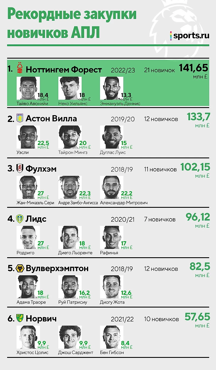 На всех потратили уже больше 100 миллионов. С такими цифрами «Форест» стал первым в списке самых тратящихся новичков в истории Премьер-лиги, обогнав «Фулхэм» и «Астон Виллу».