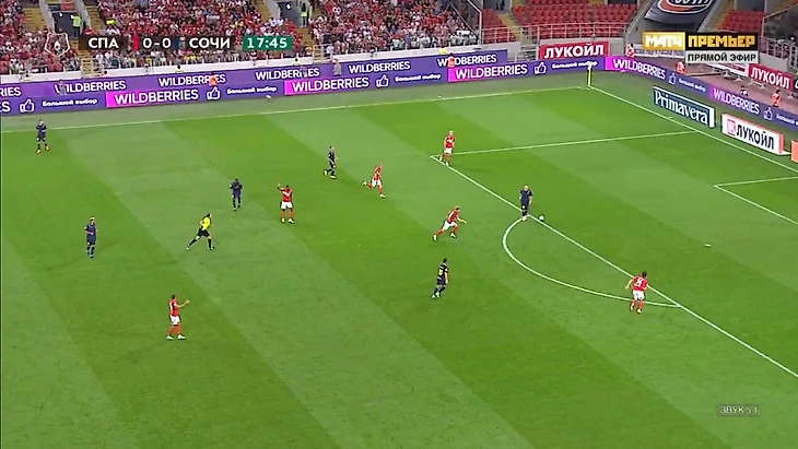 На самом деле офсайда и близко не было! Спартаковец Литвинов находился ощутимо глубже, но Мелкадзе его просто не видел. Вот момент, когда Георгий мог подхватывать мяч и сближаться с Александром Селиховым. Корень проблемы – он спиной к Литвинову.