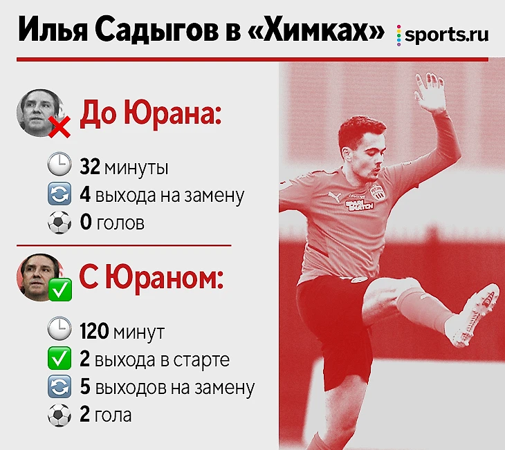 Любопытно, что при Юране Садыгов-младший играл за «Химки» гораздо чаще, чем до Юрана. Нападающий даже дважды выходил в старте, в апреле 2022-го против ЦСКА (4:2) и в мае против «Зенита» (0:1), и забивал голы.