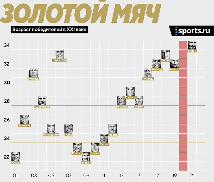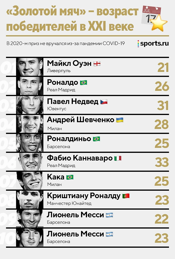 • Вместе с гонкой Роналду и Месси менялся и возраст победителей – до начала их дуэли «ЗМ» после 30 лет брали всего дважды (Недвед и Каннаваро). Лео и Криштиану задали тренд – взяли четыре приза после 30 лет.