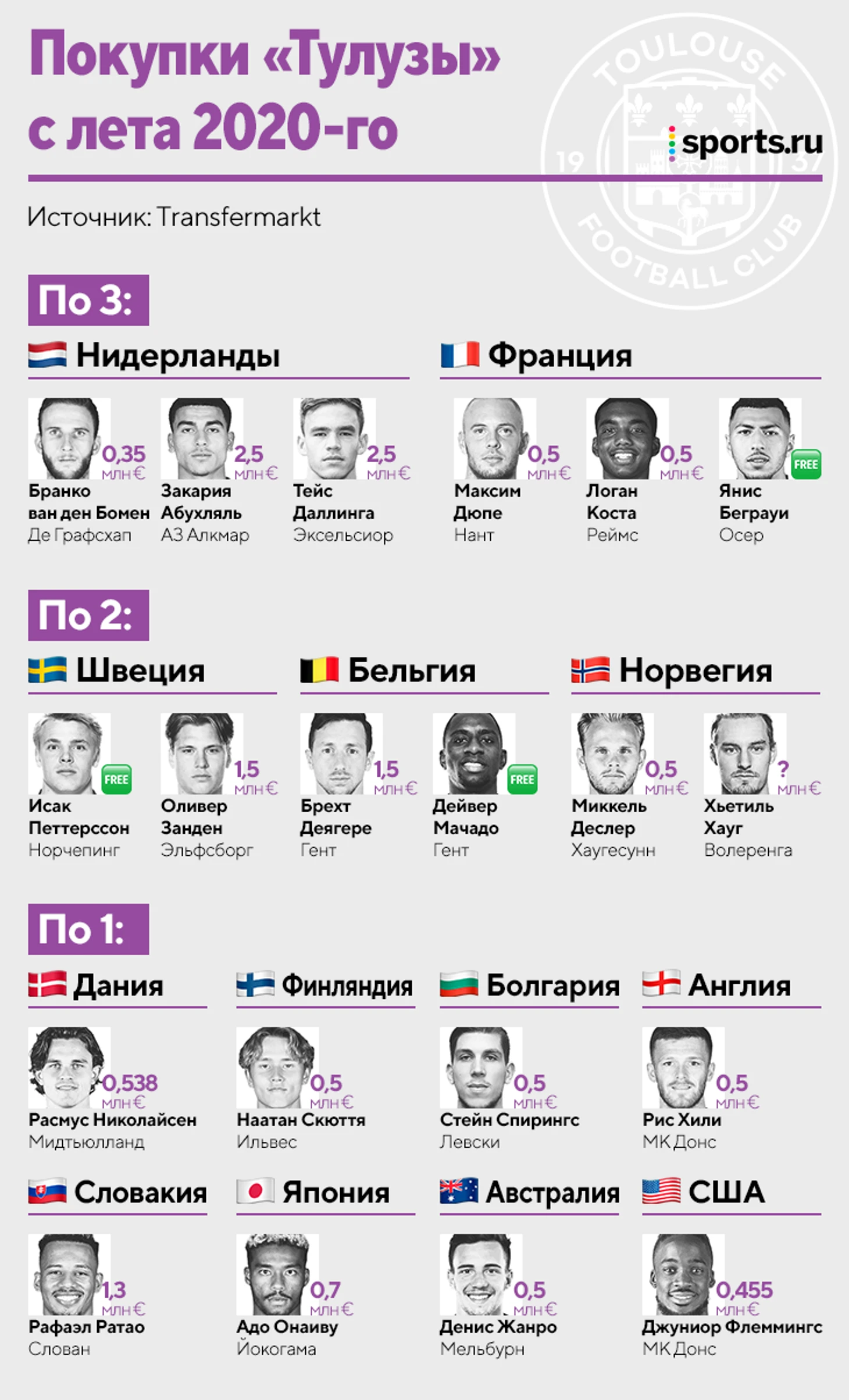 Больше всего «Тулуза» брала игроков из Франции и Нидерландов (по 3). Стейн Спирингс формально перешел из болгарского «Левски», но его тоже можно легко зачислить к голландским кейсам, поскольку в Болгарии он провел лишь полгода, а до этого вся карьера ограничивалась клубами из Нидерландов.