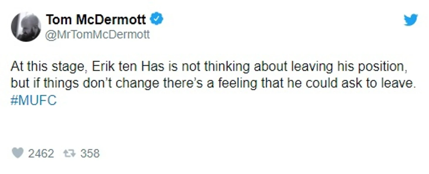 Он добавил, что, хотя тен Хаг в настоящее время не думает об уходе, есть ощущение, что его мнение может измениться, если ситуация не улучшится.