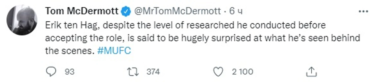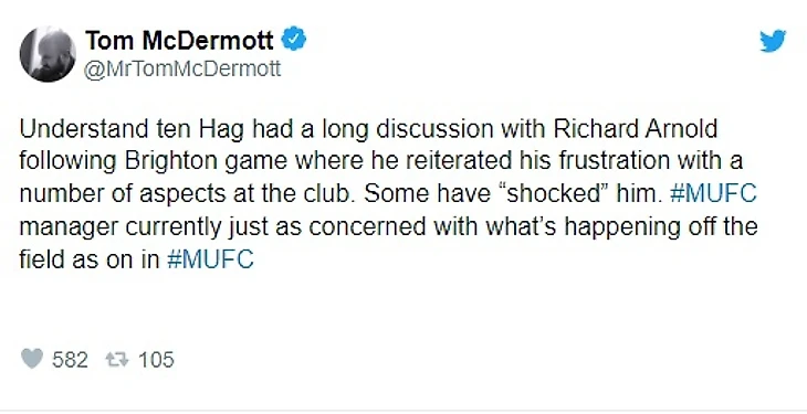 «У тен Хага была долгая дискуссия с Ричардом Арнольдом после игры с «Брайтоном», где он выразил свое разочарование рядом аспектов в клубе. Некоторые из них его «шокируют». Главный тренер «МЮ» озадачен не только проблемами все поля, но и на нем».