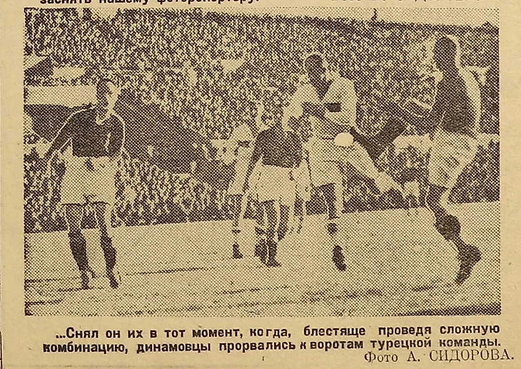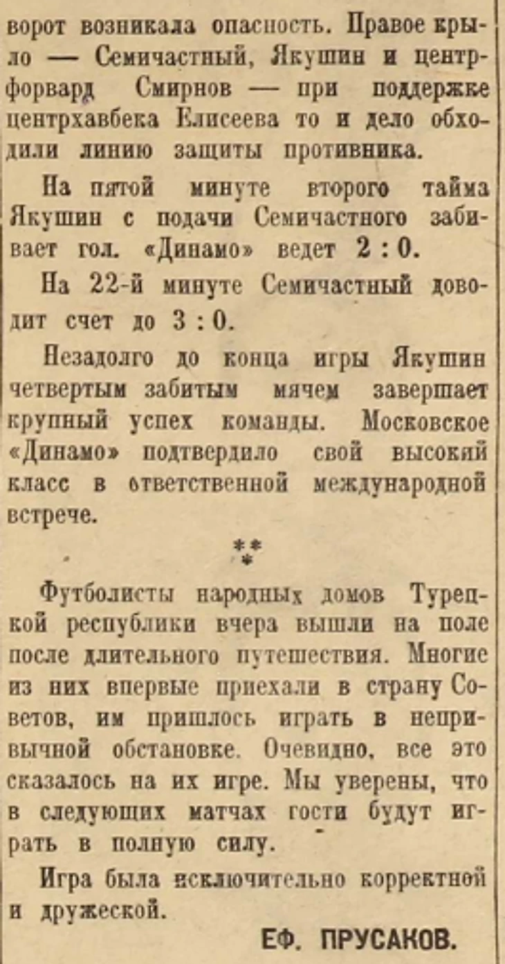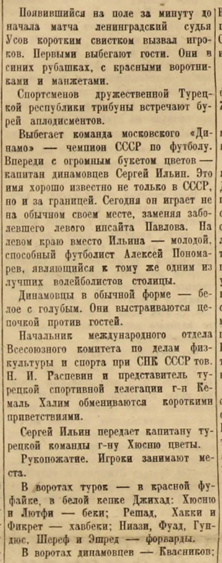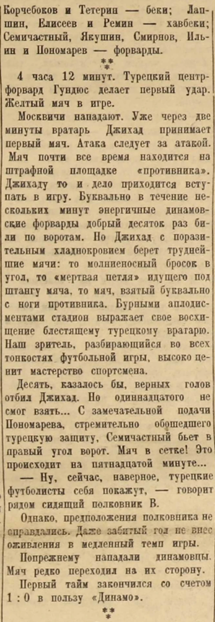По моему мнению, особо энергично действовали турецкие футболисты. Но активное противодействие наших славных динамовцев привело к тому, что игра шла, главным образом, на половине Турции. Благодаря прекрасной игре команды "Динамо", турецкие футболисты не смогли провести ни одной комбинации, которая в результате дала бы гол.