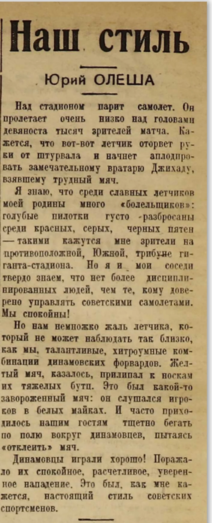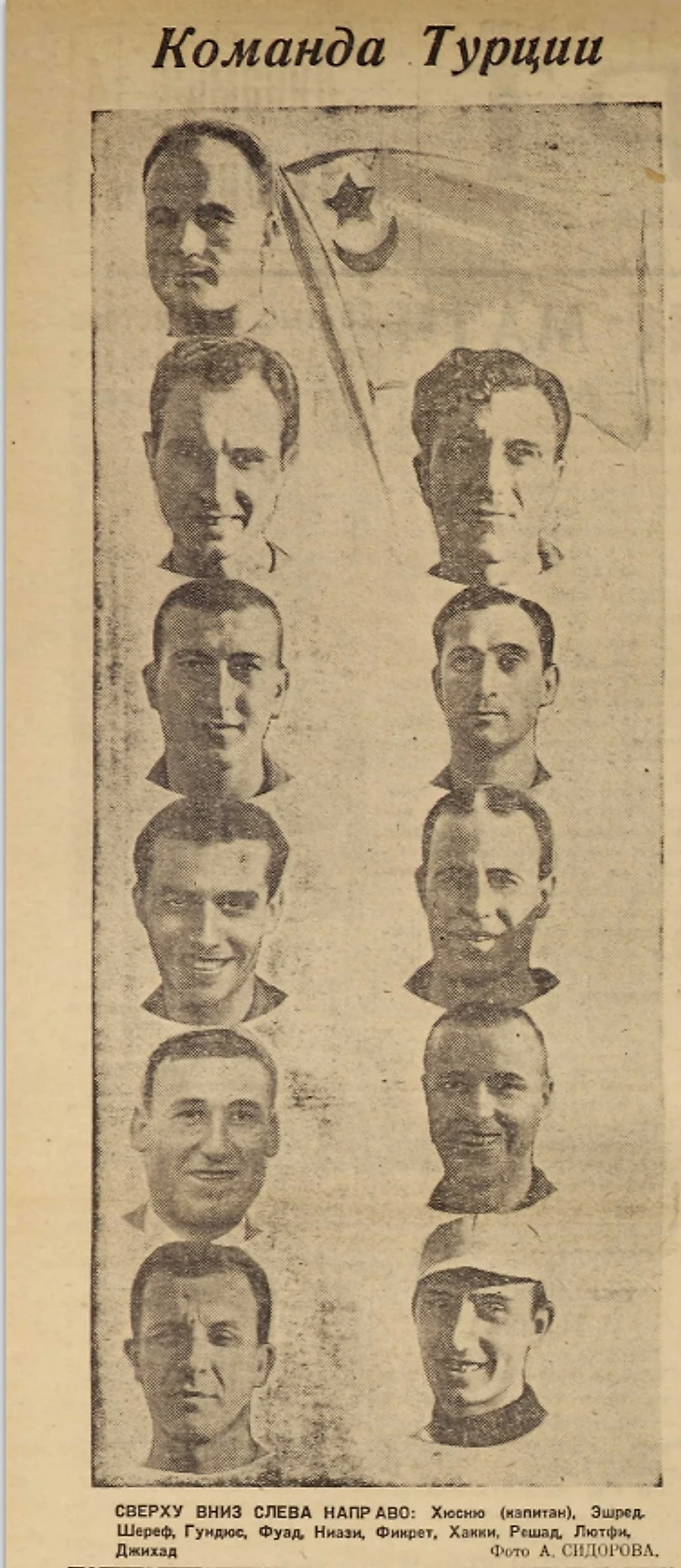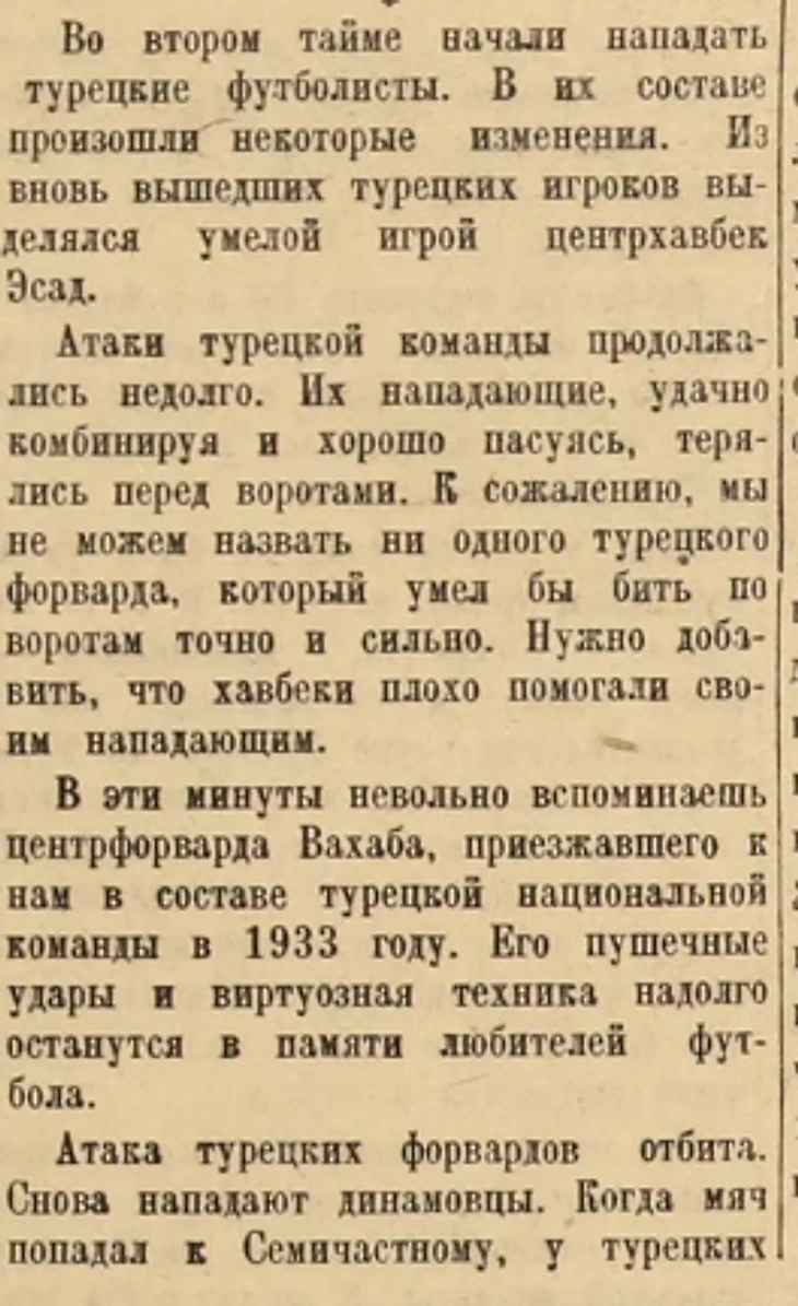 Турецкие футболисты - их игру я наблюдаю в течении ряда лет - также показали хороший класс. Особенно следует отметить блестящую игру турецкого вратаря Джихада.В том составе, в котором мы видели вчера, турецкая команда могла играть еще лучше. Я был свидетелем её превосходной игры в Стамбуле с югославскими и венгерскими футболистами. Я уверен, что в дальнейших встречах в СССР наши турецкие друзья покажут полностью свой класс игры.