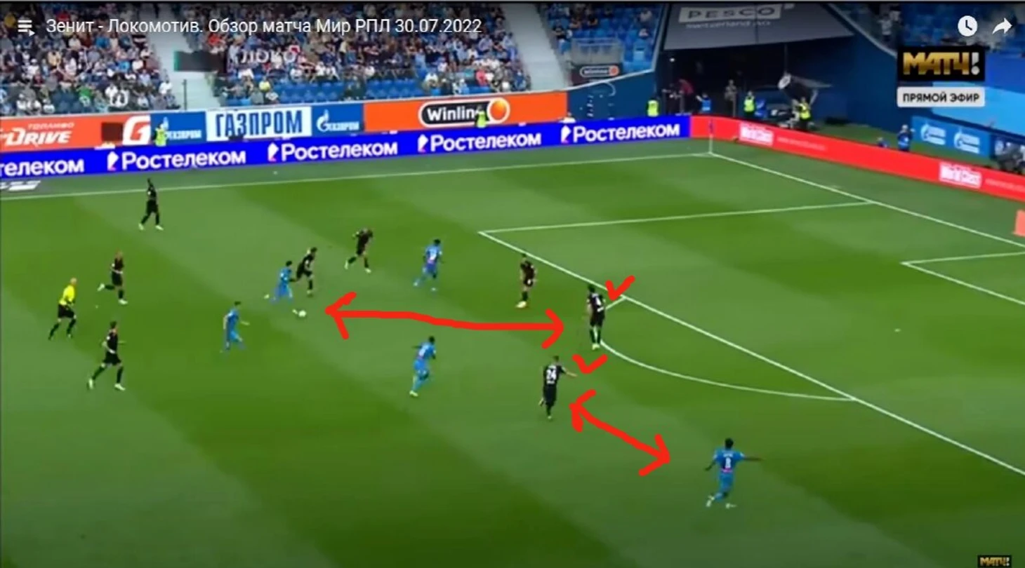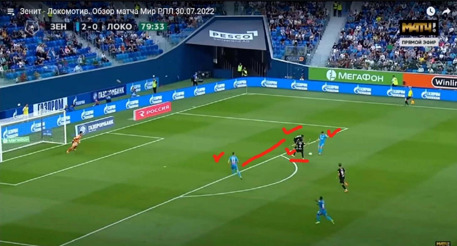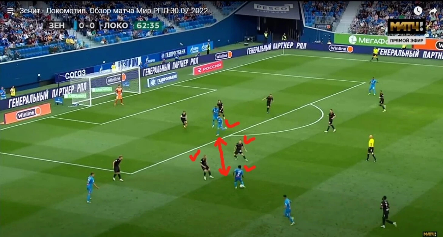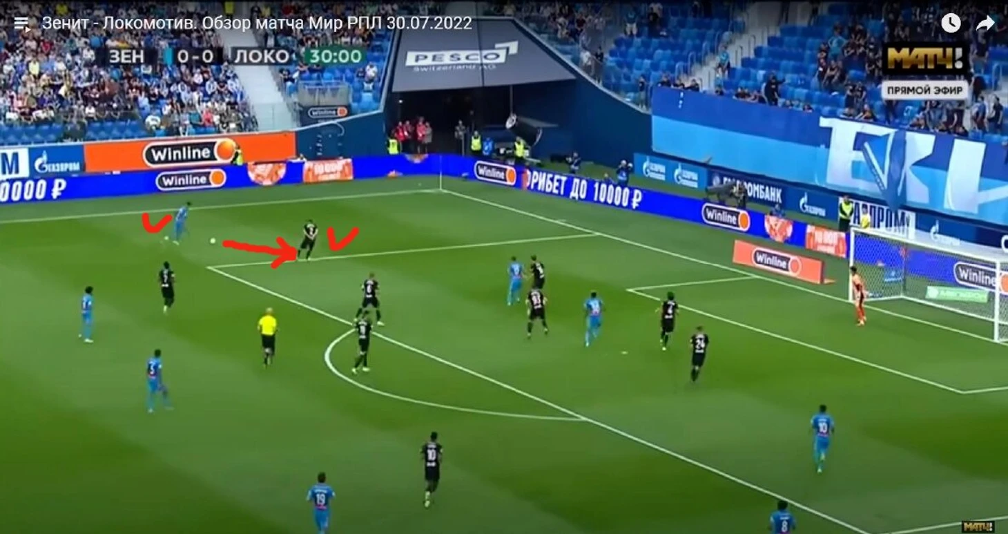 Еще одна ситуация с передачами с флангов. На этот раз в игре с Зенитом. Игрок Локомотива даже не выдвигается навстречу игроку Зенита. Просто стоит, спрятав руки за спину.