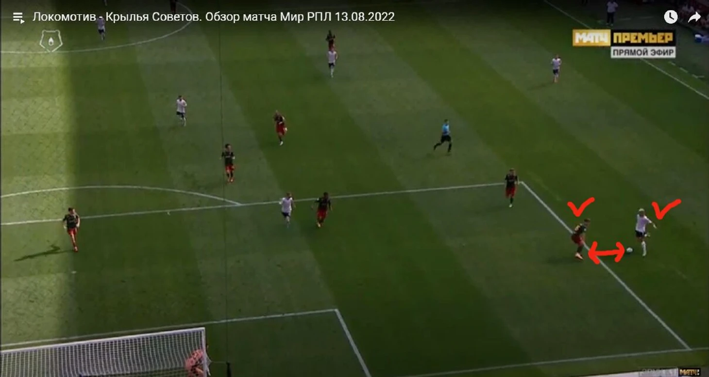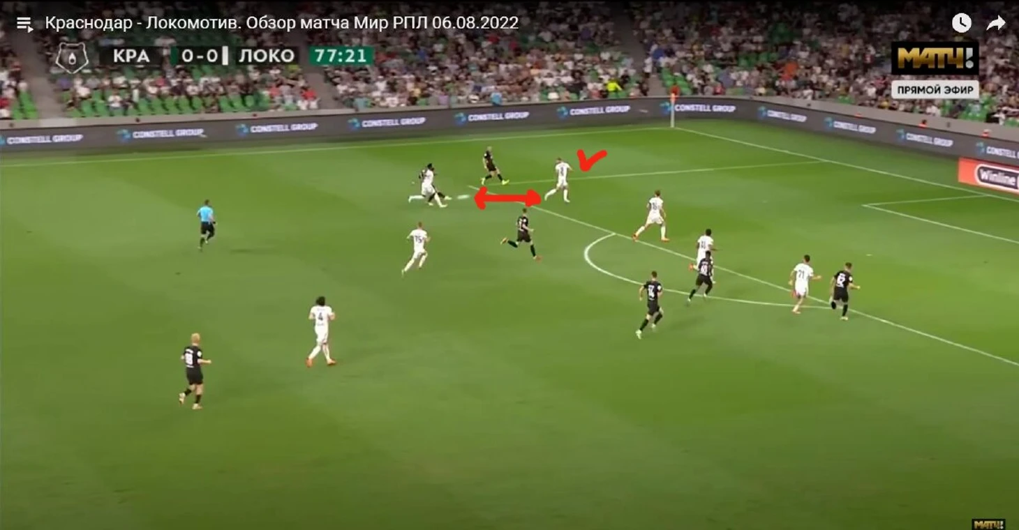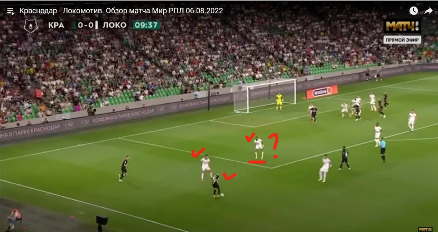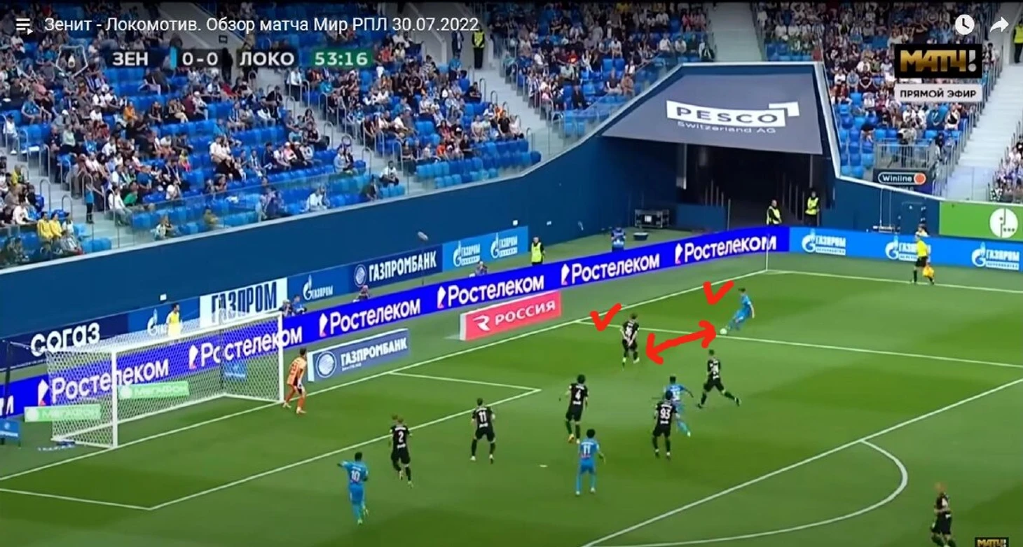 Еще одна ситуация с передачами с флангов. На этот раз в игре с Зенитом. Игрок Локомотива даже не выдвигается навстречу игроку Зенита. Просто стоит, спрятав руки за спину.