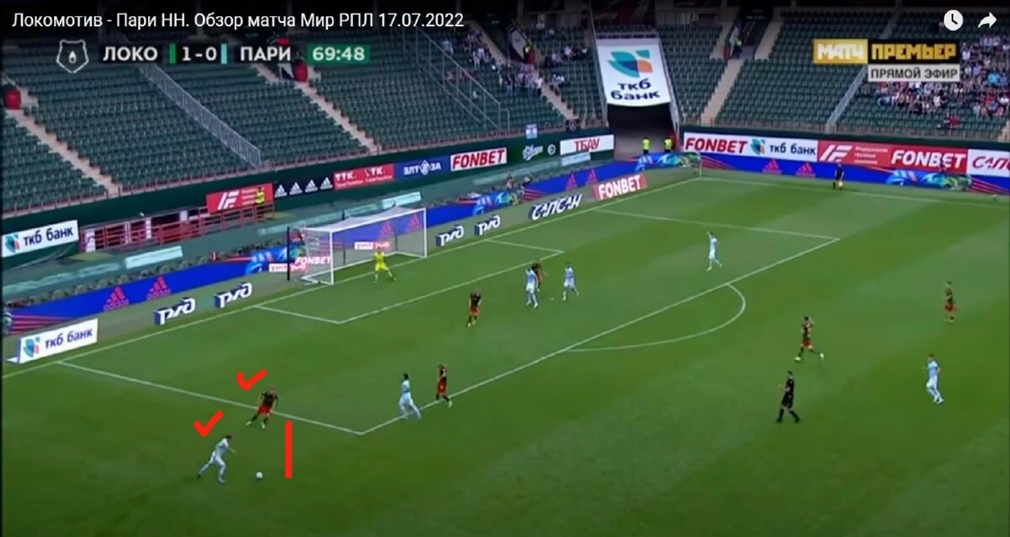 Здесь отчетливо видно, как игрок Пари НН совершенно свободно подает в штрафную железнодорожников, после чего происходит голевая атака. Почему футболист "Локо" дает возможность абсолютно спокойно делать подачу в свою штрафную, абсолютно не понятно. Я раньше занимался футболом, пусть конечно и не на высоком уровне, но нас всегда тренер заставлял блокировать любую подачу, или прострел, активно препятствовать любым передачам с флангов. Неужели теперь в спортивных школах этого не требуют? Или тренерский штаб Локомотива не уделяет этому должного внимания?