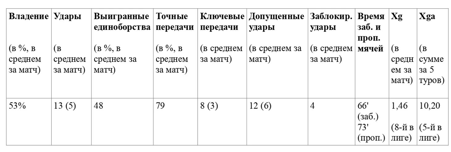 Низкий процент выигранных единоборств Ни в одном из первых пяти матчей процент выигранных единоборств игроками «Локо» не превышал 50%, а в двух был и вовсе в диапазоне от 44 до 49% (с Ростовом, Зенитом и Краснодаром). Это очень низкий показатель, именно здесь нужно искать источник многих проблем. Один из пропущенных голов в матче с Краснодаром- яркий тому пример: после подачи углового в борьбе проигран подбор, далее последовала быстрая контратака с длинным пасом. Другие пропущенные голы также пришли из-за недостаточной борьбы, о чем мы еще отдельно поговорим далее. В футбол без борьбы играть нельзя, и, к сожалению, многие молодые игроки этого не понимают. Понятно, что это должны объяснять еще в детских спортивных школах, но если игрок не усвоил это там, то главный тренер на взрослом уровне обязан заставить игроков вести интенсивную борьбу на поле. В футболе выигрывает часто та команда, за которой остаются единоборства, а не та, которая лучше перекатывает мяч на своей половине поля и технично пасует пятками. Диего Симеоне, например, согласится с этим постулатом. Футбол «Атлетико Мадрид» построен именно на этом базовом принципе. Бороться на каждом участке поля, создав максимально некомфортные условия для игры соперника. Другие статистические показатели приведены на фото ниже. Не будем слишком подробно на них останавливаться, но отметим самые главные аспекты.