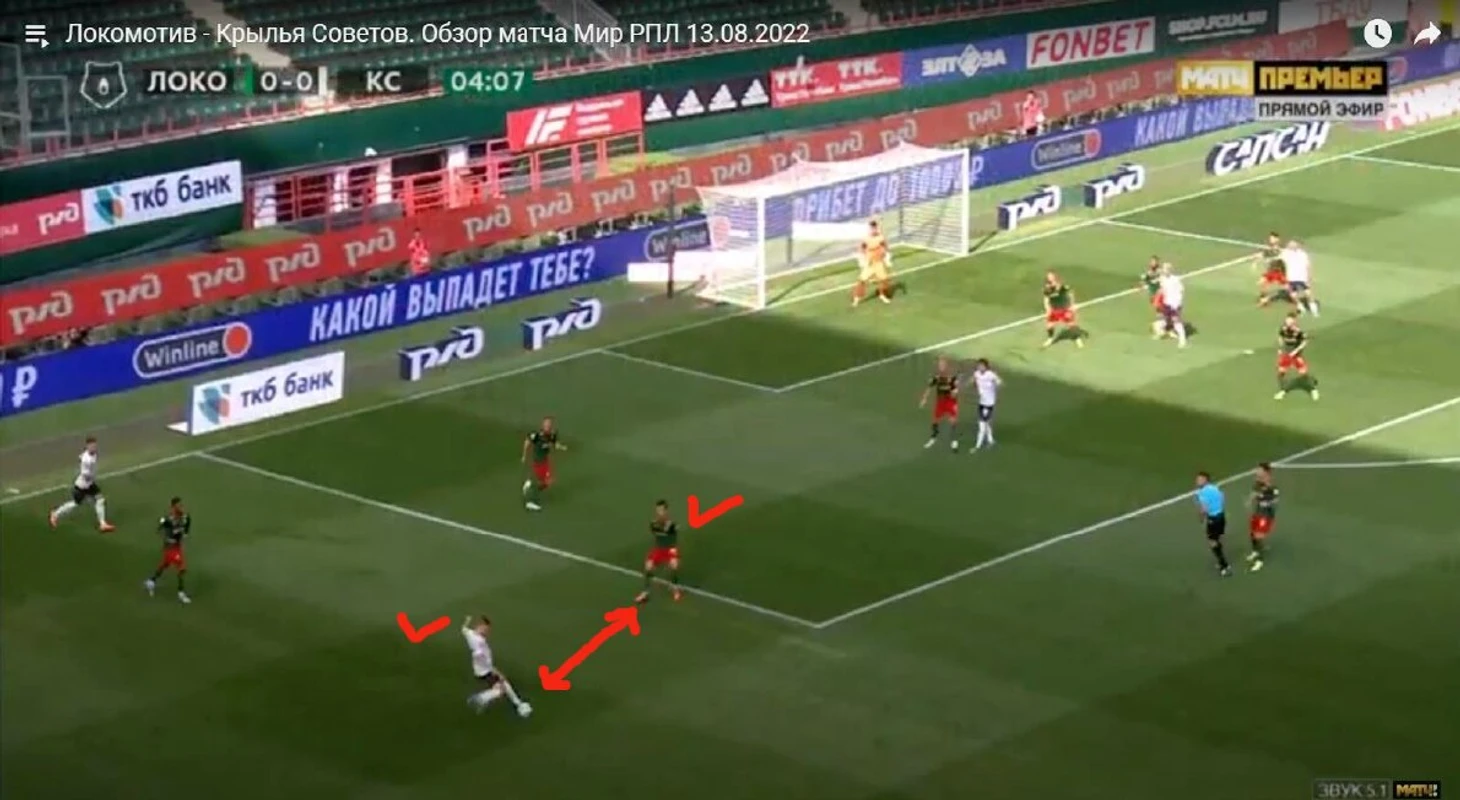 Очень опасная комбинация "Крыльев", а предшествует ей свободная передача в штрафную. Игрок Локомотива опять просто стоит в штрафной, с надеждой, что игрок соперника попадет в него, но этого не происходит, пас получается опасный.