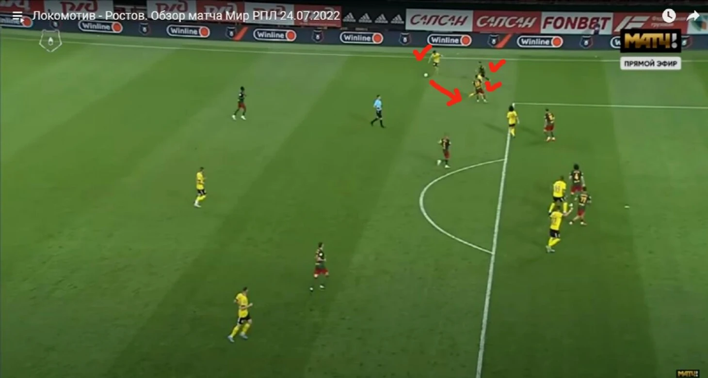 Момент из матча с Ростовом. Аналогичная ситуация. Игроки "Локо" не встречают игрока Ростова. Зачем-то вдвоем держат другого игрока ростовчан.